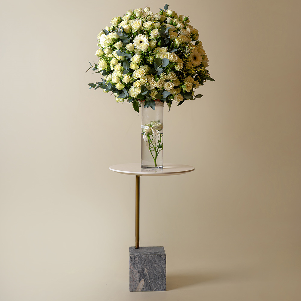 A bouquet containing baby roses and carnations, arranged beautifully in a vase.