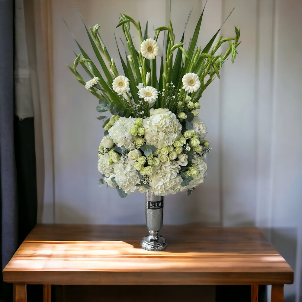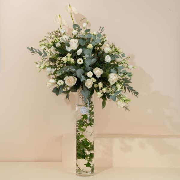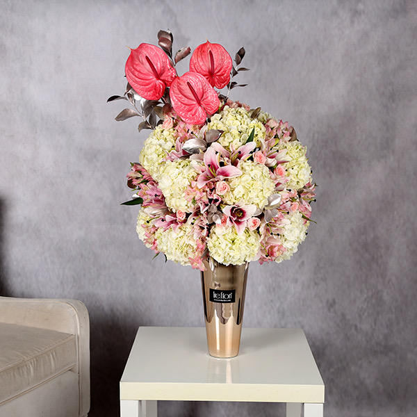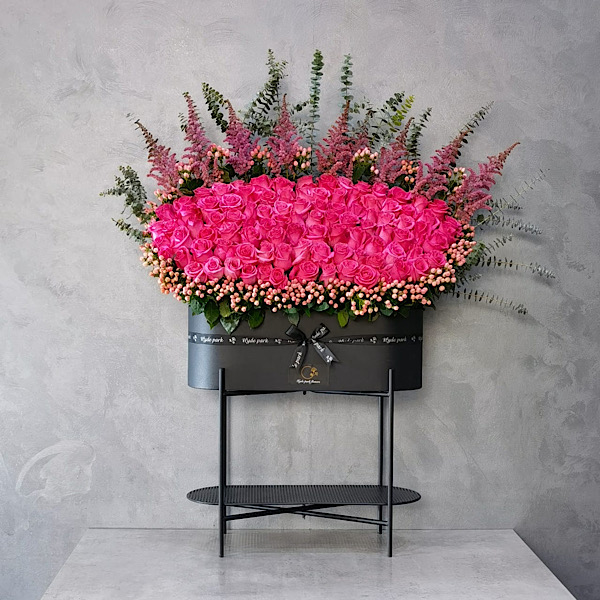 Baby roses and delphiniums arranged beautifully in a box.