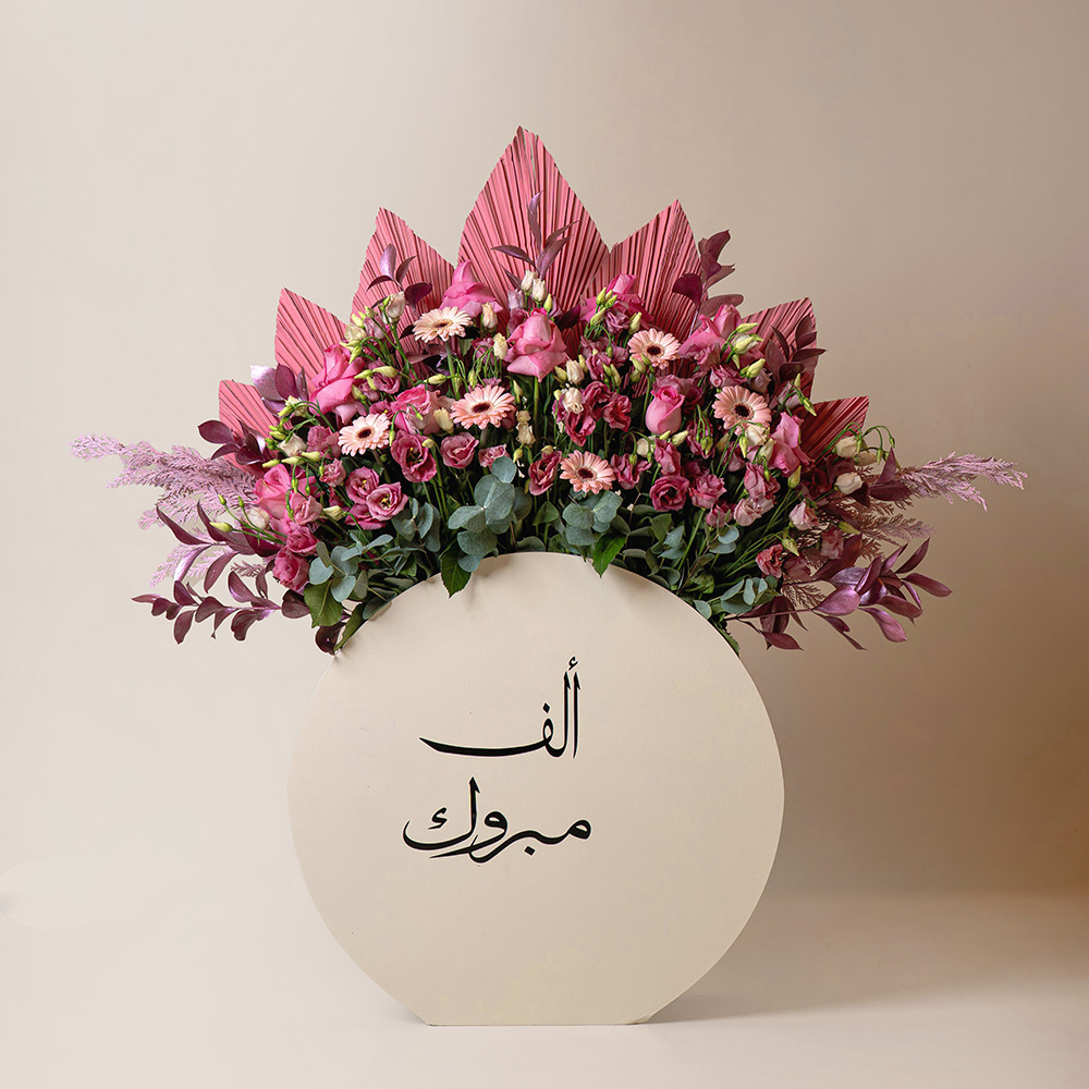 A bouquet containing roses, baby roses, and gerberas, arranged beautifully in a stand.