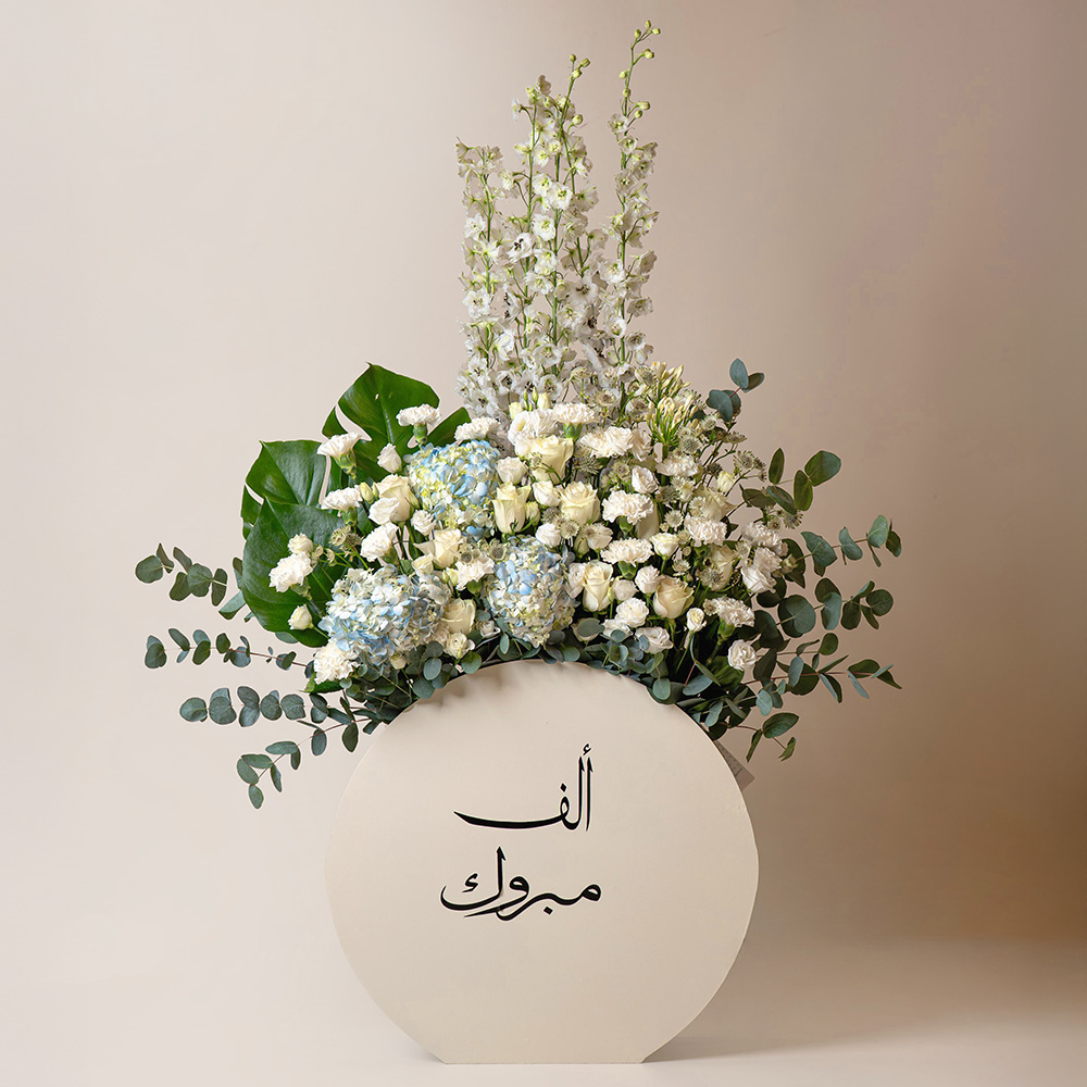 A bouquet containing roses, baby roses, hydrangeas, delphiniums, and carnations, arranged beautifully in a stand.