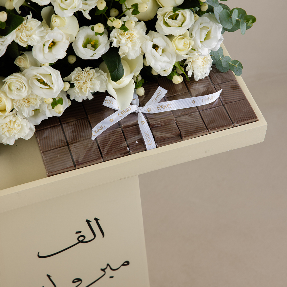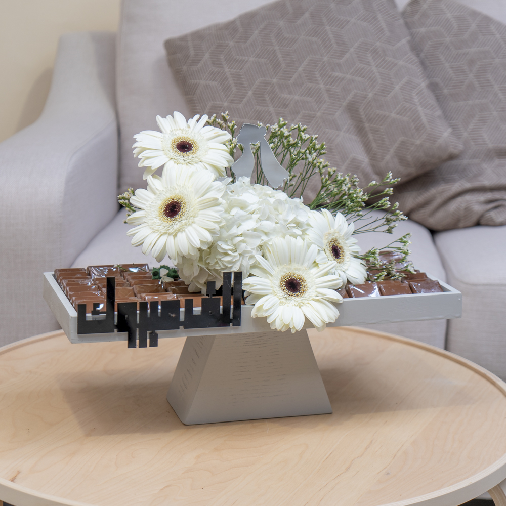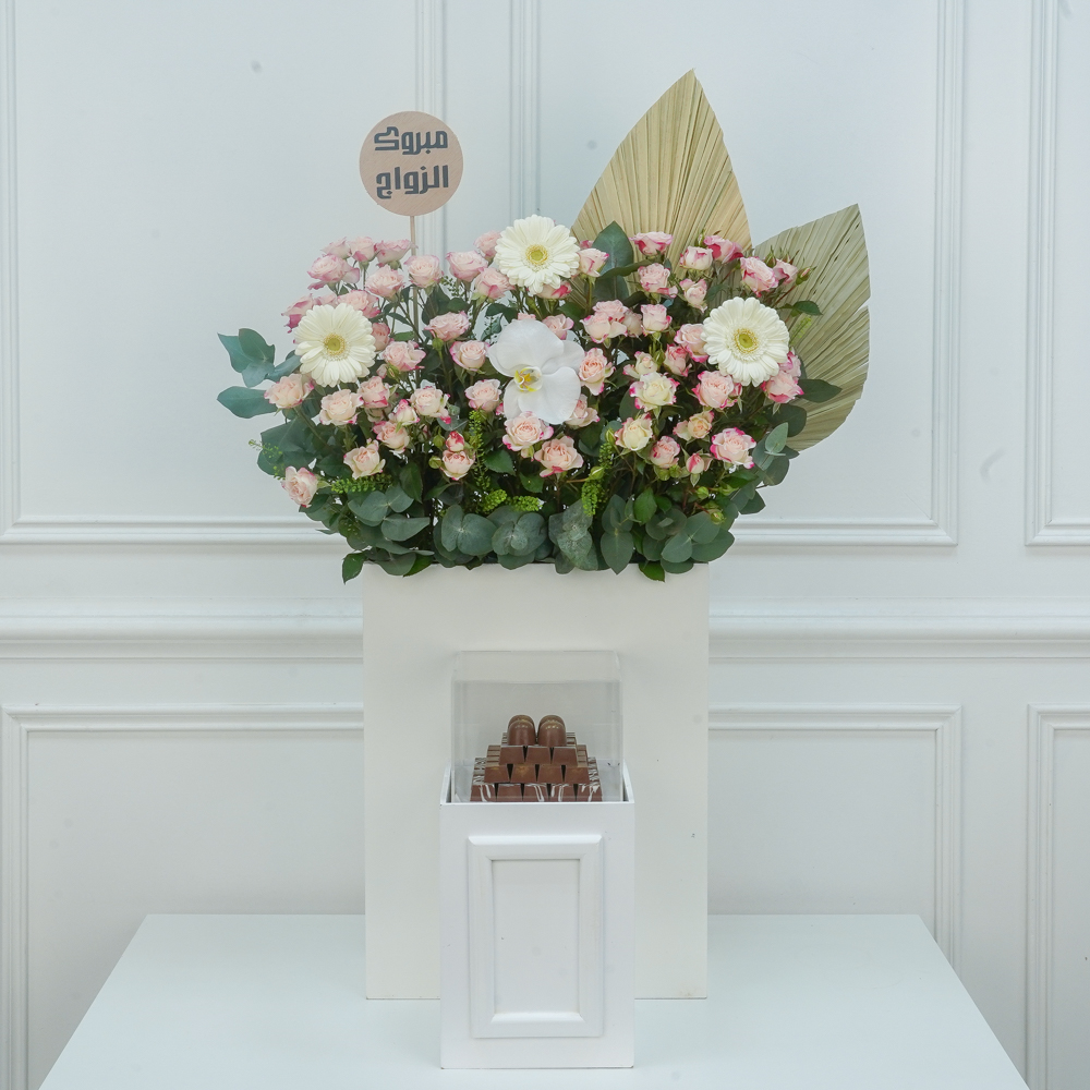 This stand contains rose, delphinium, tulip, and gerbera flowers with chocolates.