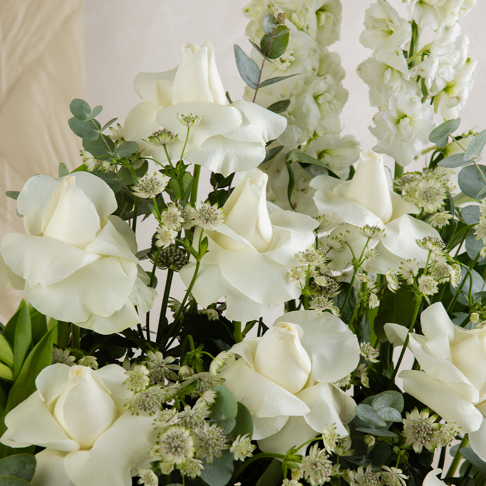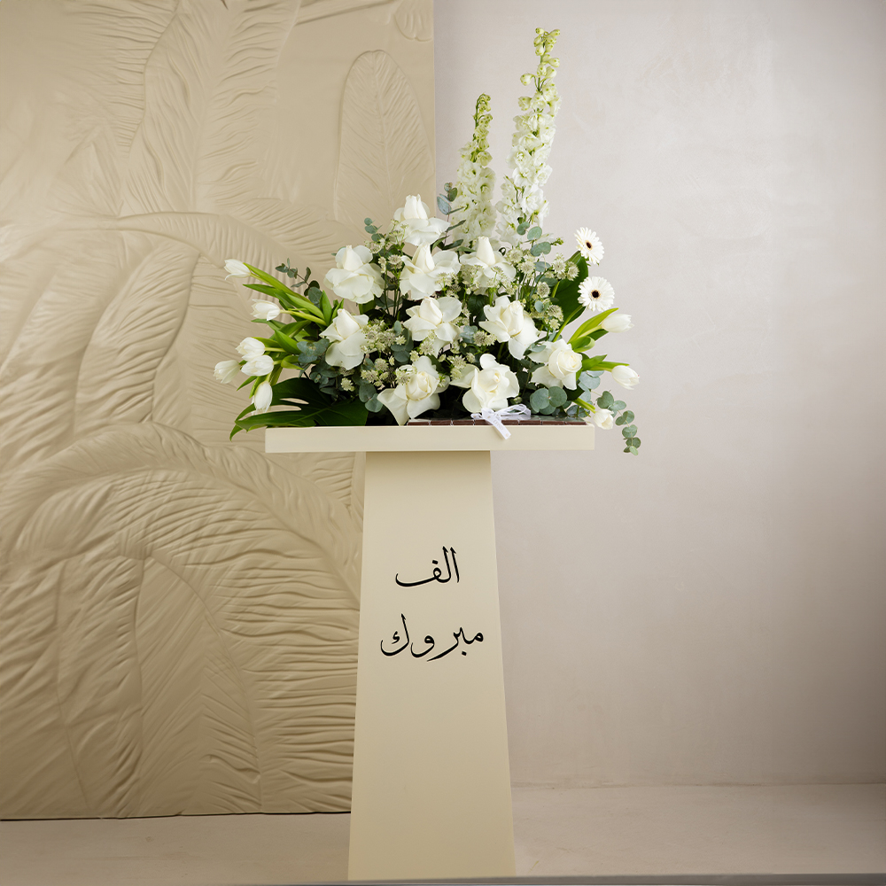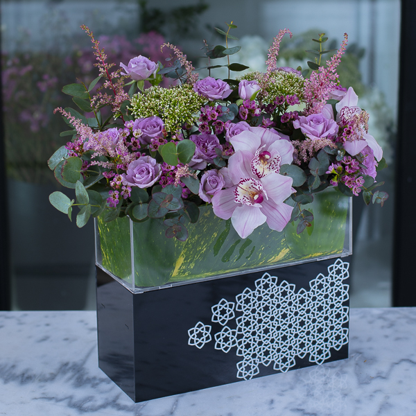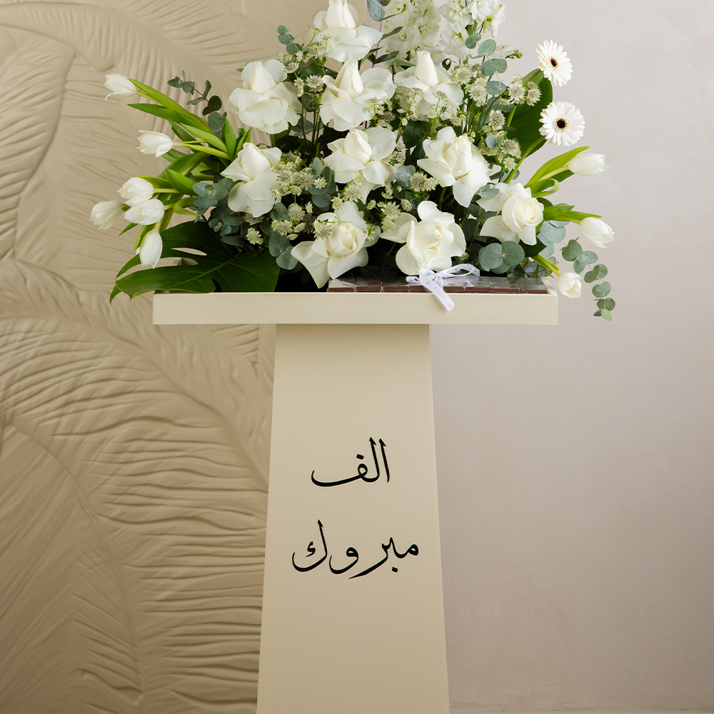 This stand contains rose, delphinium, tulip, and gerbera flowers with chocolates.