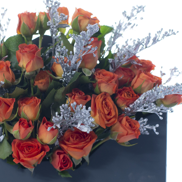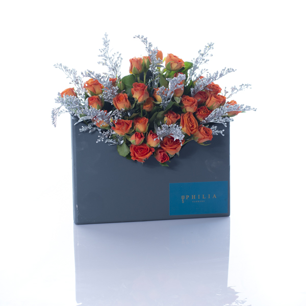 A bouquet of orange baby roses in envelope.