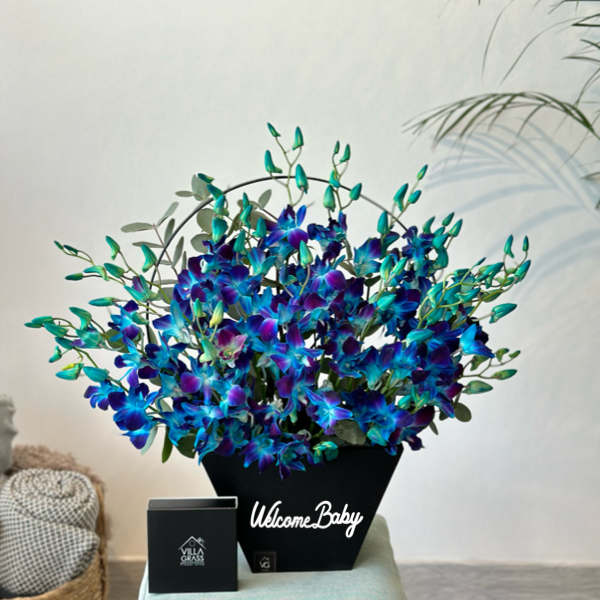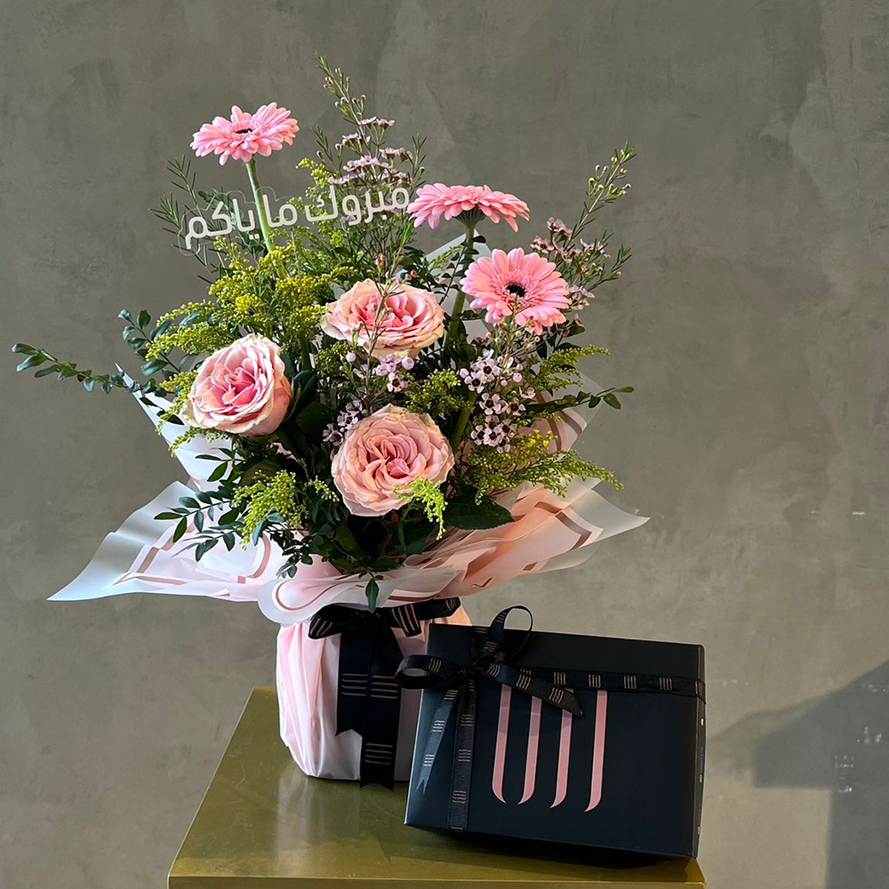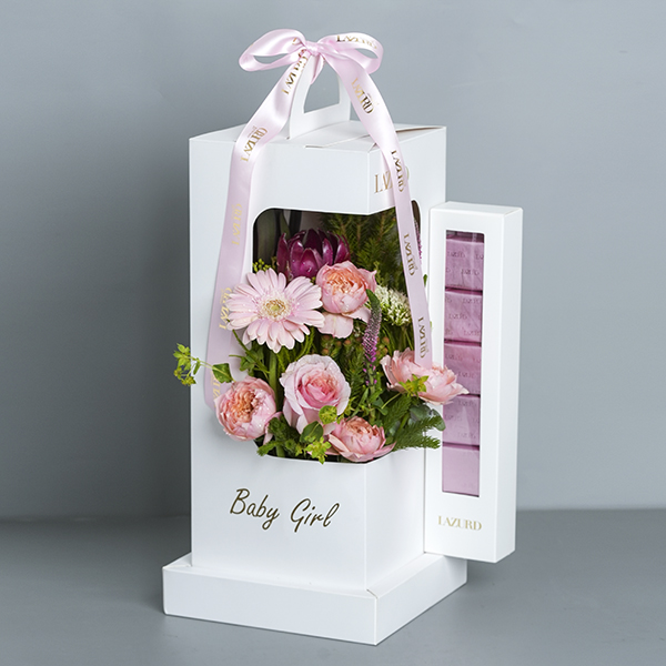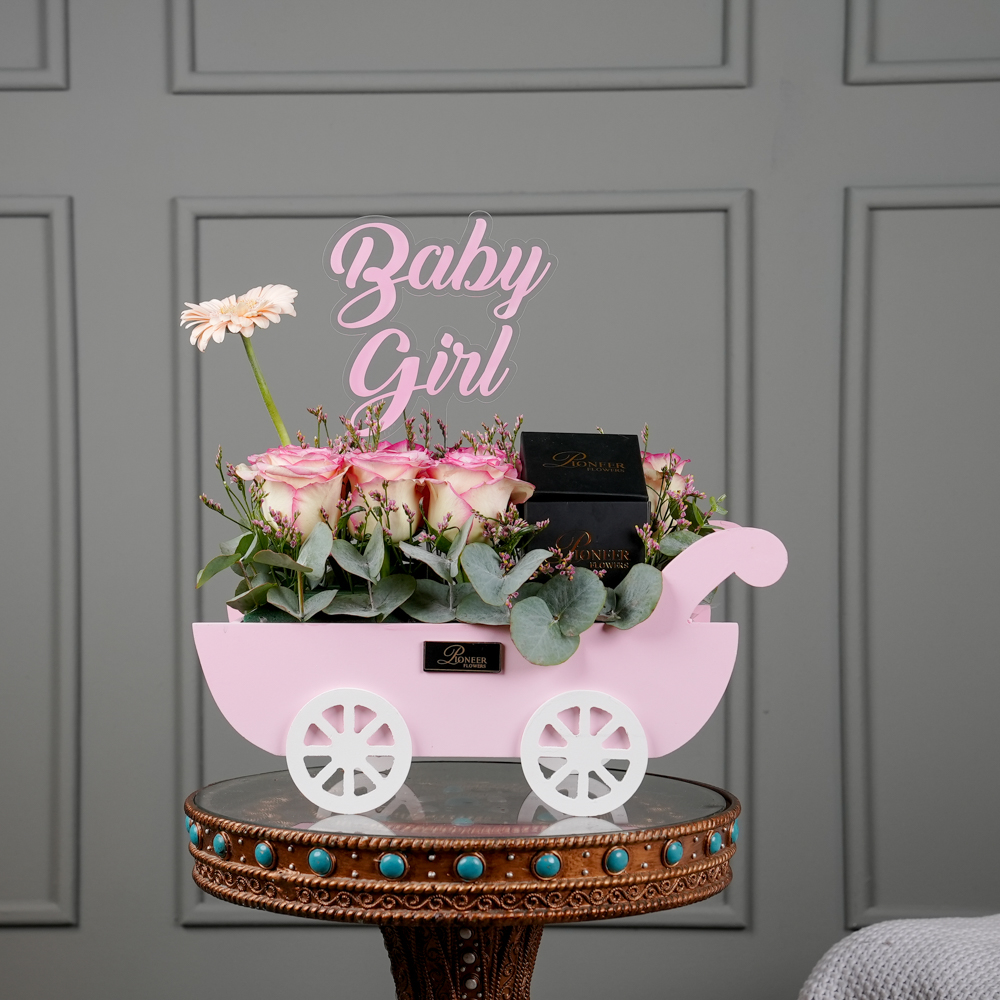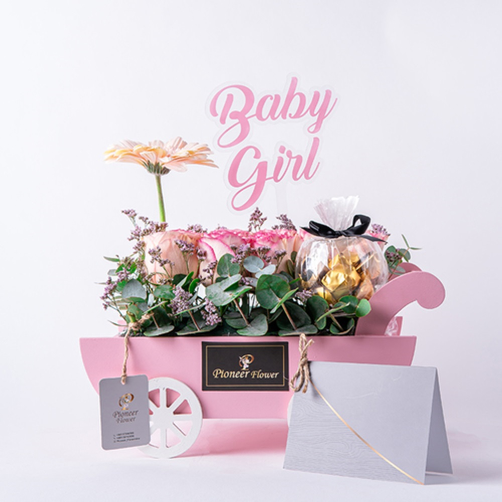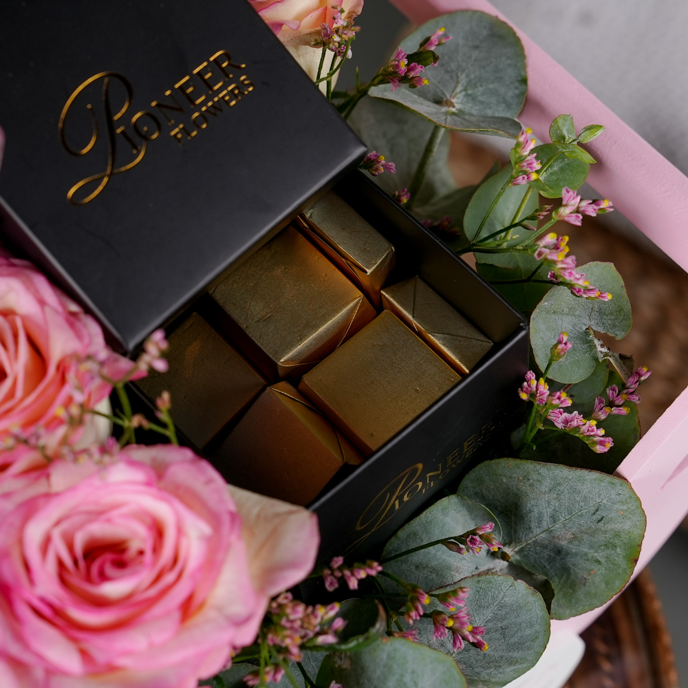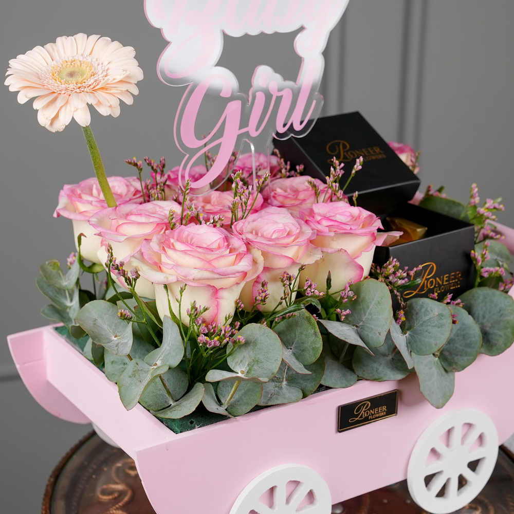 The bouquet contains a pink wooden trolley filled with roses, gerbera, limonium, eucalyptus, and Belgian chocolates.