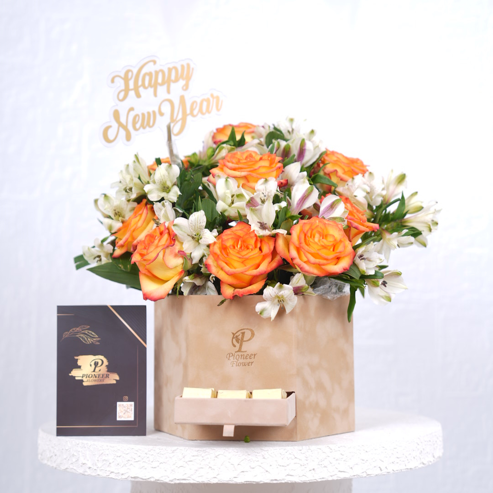 This bouquet contains orange roses and white alstroemerias. Comes with chocolates.