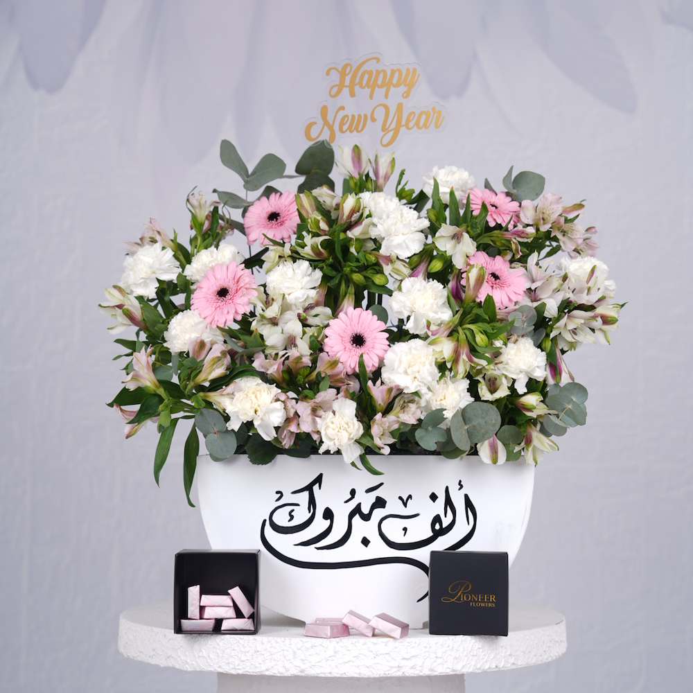 This bouquet contains carnation, gerbera, alstroemeria, and eucalyptus with Belgian chocolate.