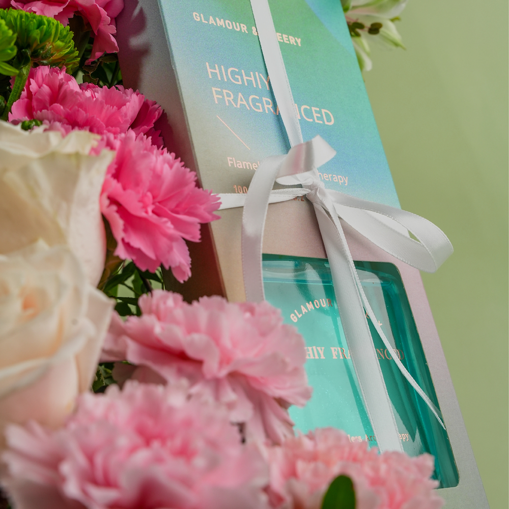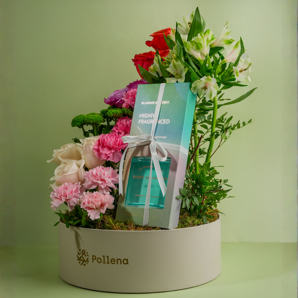 A box that contains roses, alstroemerias and carnations along with a scented diffuser.