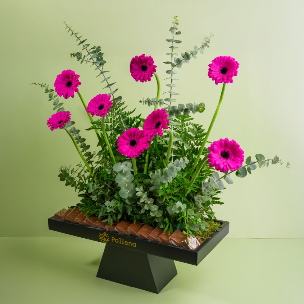 A tray that contains gerberas and eucalyptus along with chocolates.