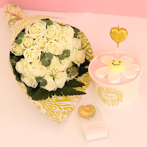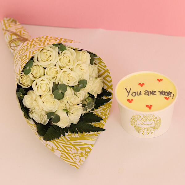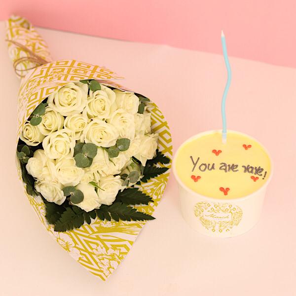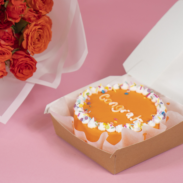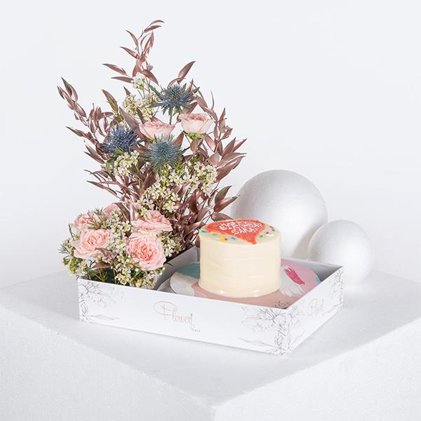 Mini cake with hand bouquet of baby roses.