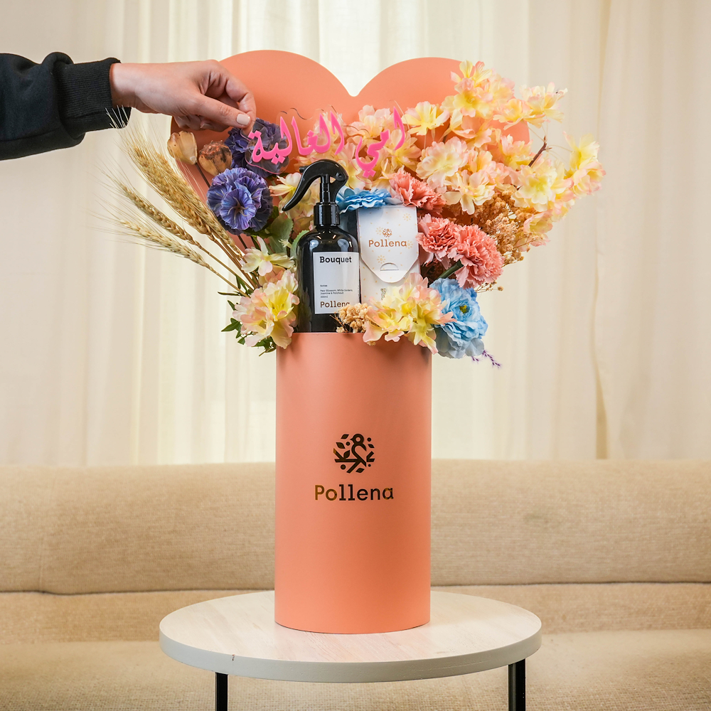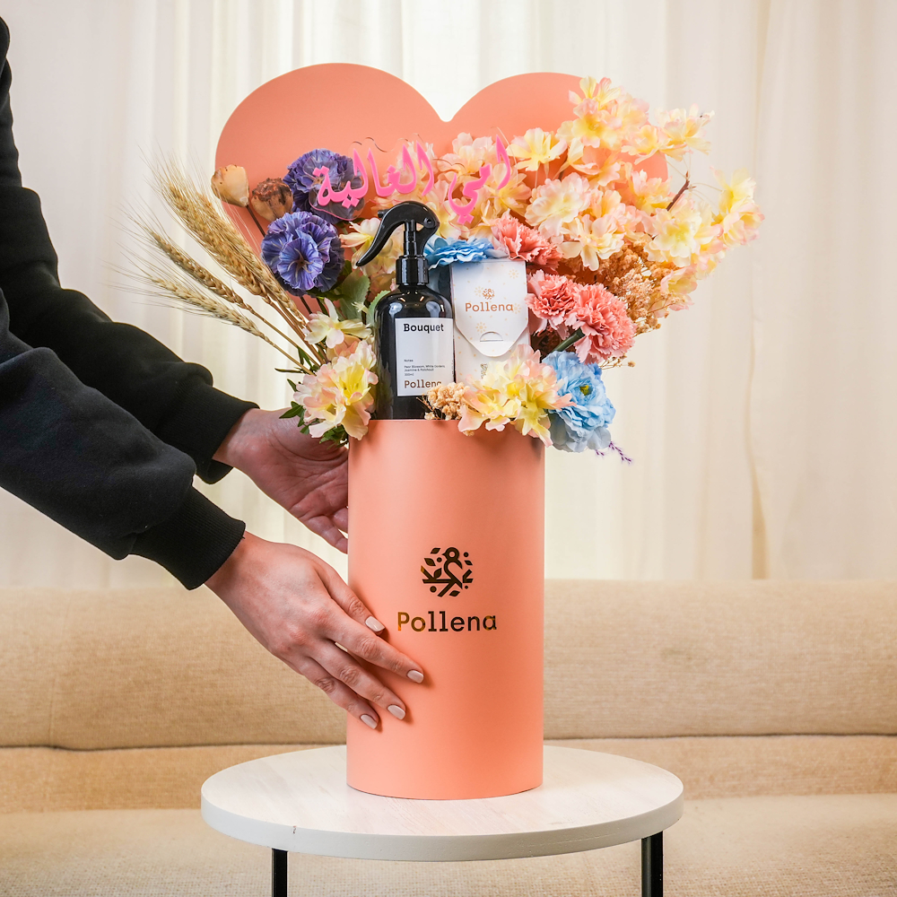 A bouquet containing preserved and artificial flowers, arranged beautifully. Comes with chocolates and a home spray.