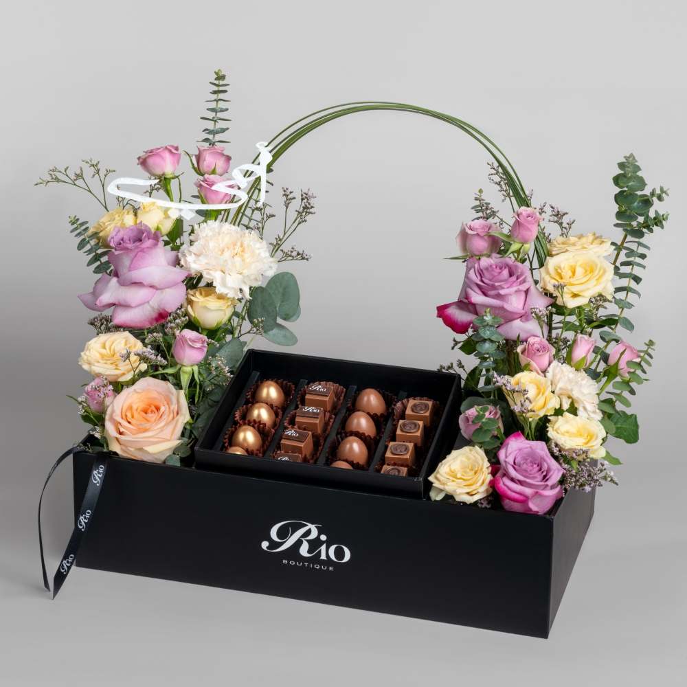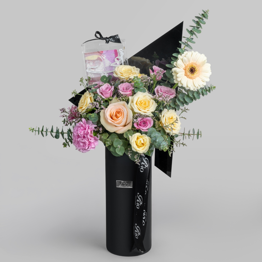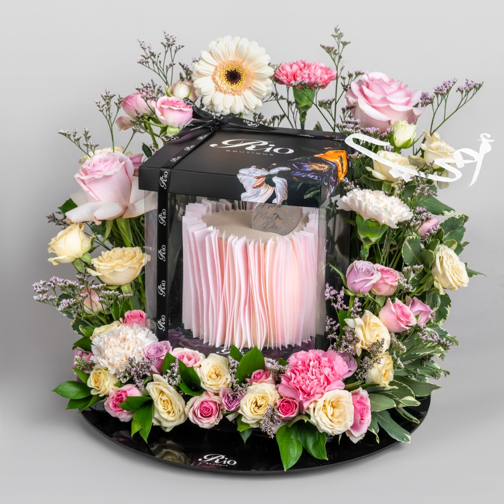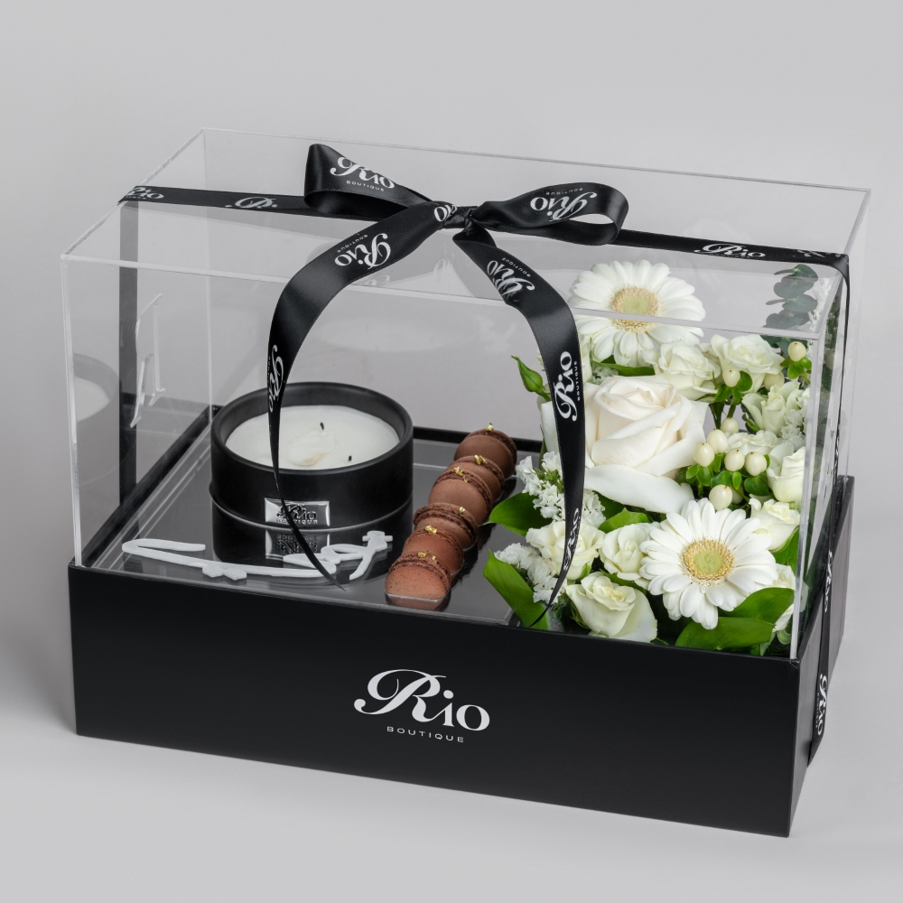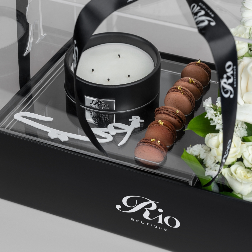 A box featuring roses, baby roses, gerberas, and hypericum alongside a scented candle and a half-dozen chocolate macarons. Finished with a Mother's Day topper, it’s a charming gift that brings warmth and joy.