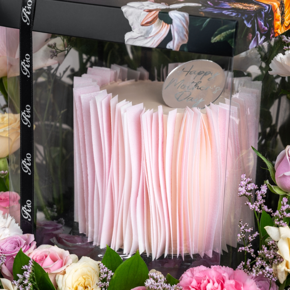 A box featuring roses, baby roses, gerberas, and carnations paired with a delicious cake and a Mother's Day topper. A delightful gift made to celebrate her special day with beauty and grace. The cake serves 3 to 4 persons.