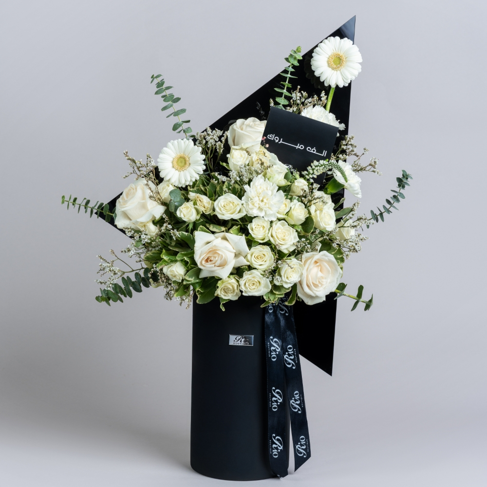 A tall vase of carnations, gerberas, roses, baby roses, and veronica in a lively display. Ideal for congratulations or any joyful moment.