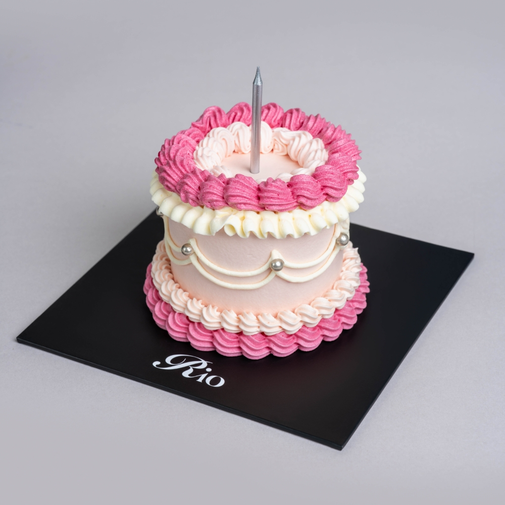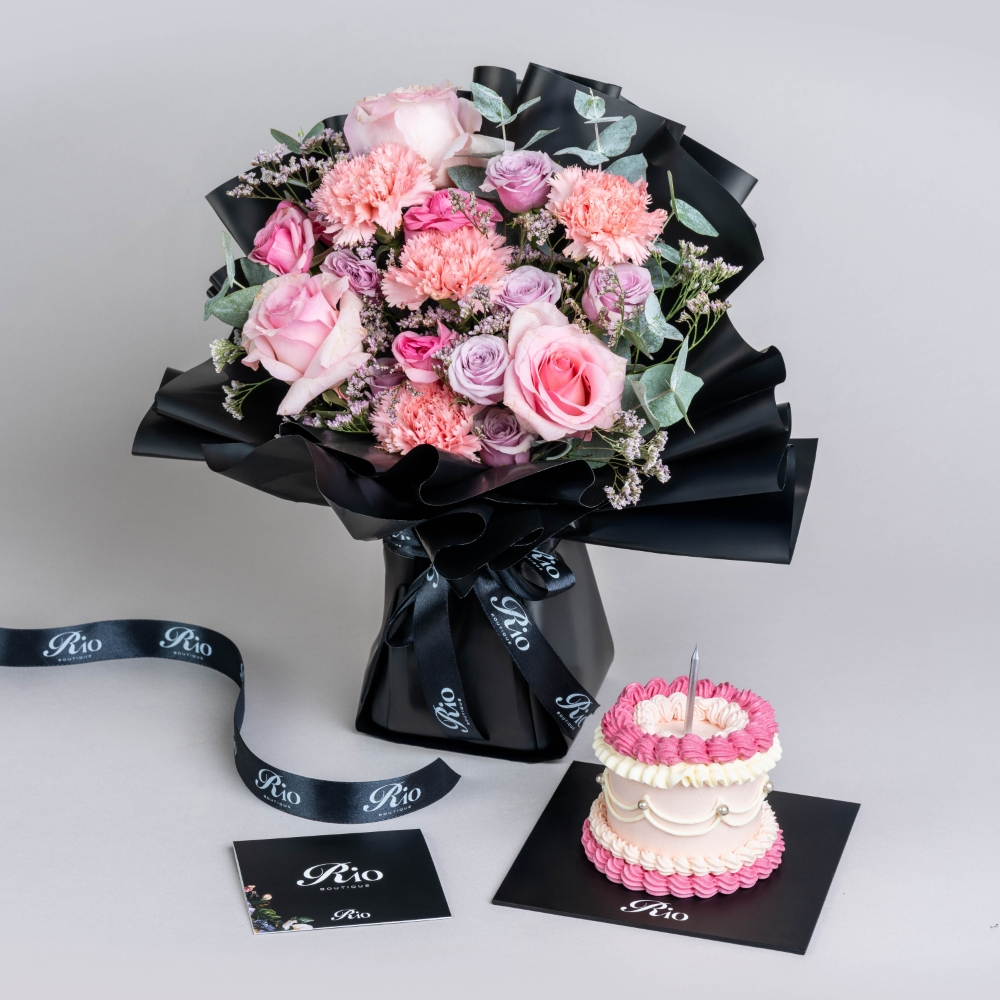 A hand bouquet of roses, baby roses, and carnations with a cake. A lovely bouquet for birthdays or celebrating life’s joys.