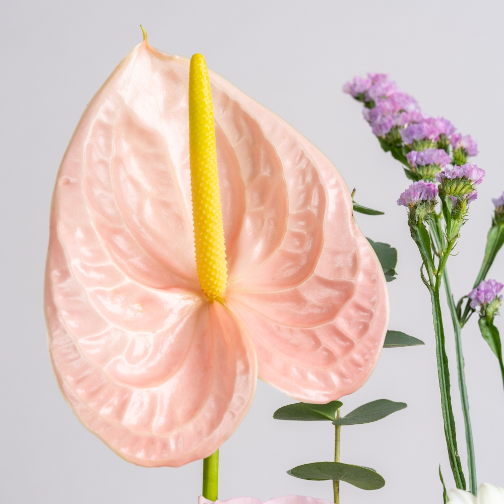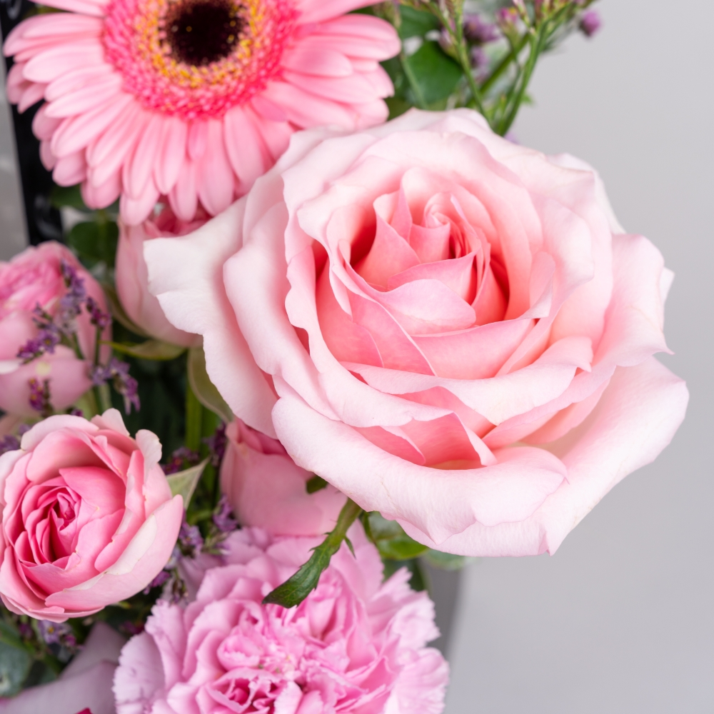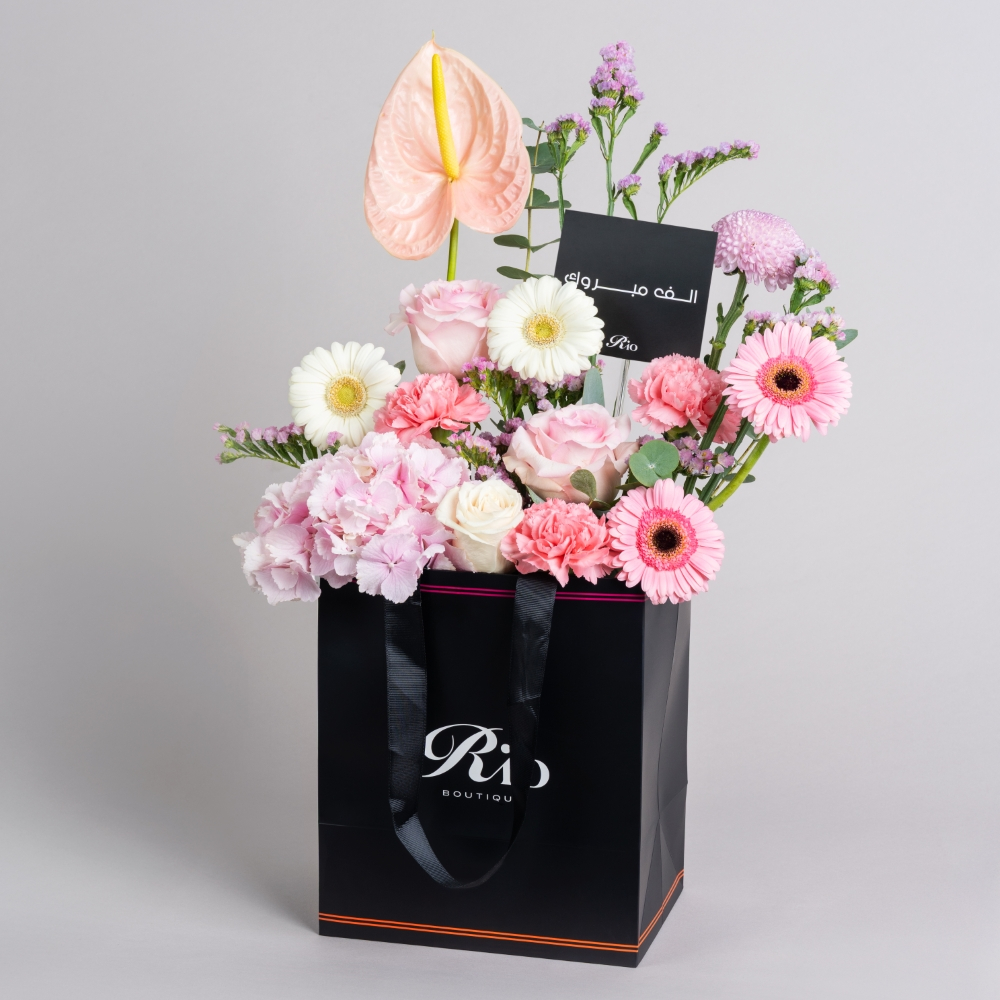 A stylish bag of gerberas, hydrangeas, ping pong flowers, and roses in a vibrant arrangement. Designed to bring congratulations or joy to any occasion.