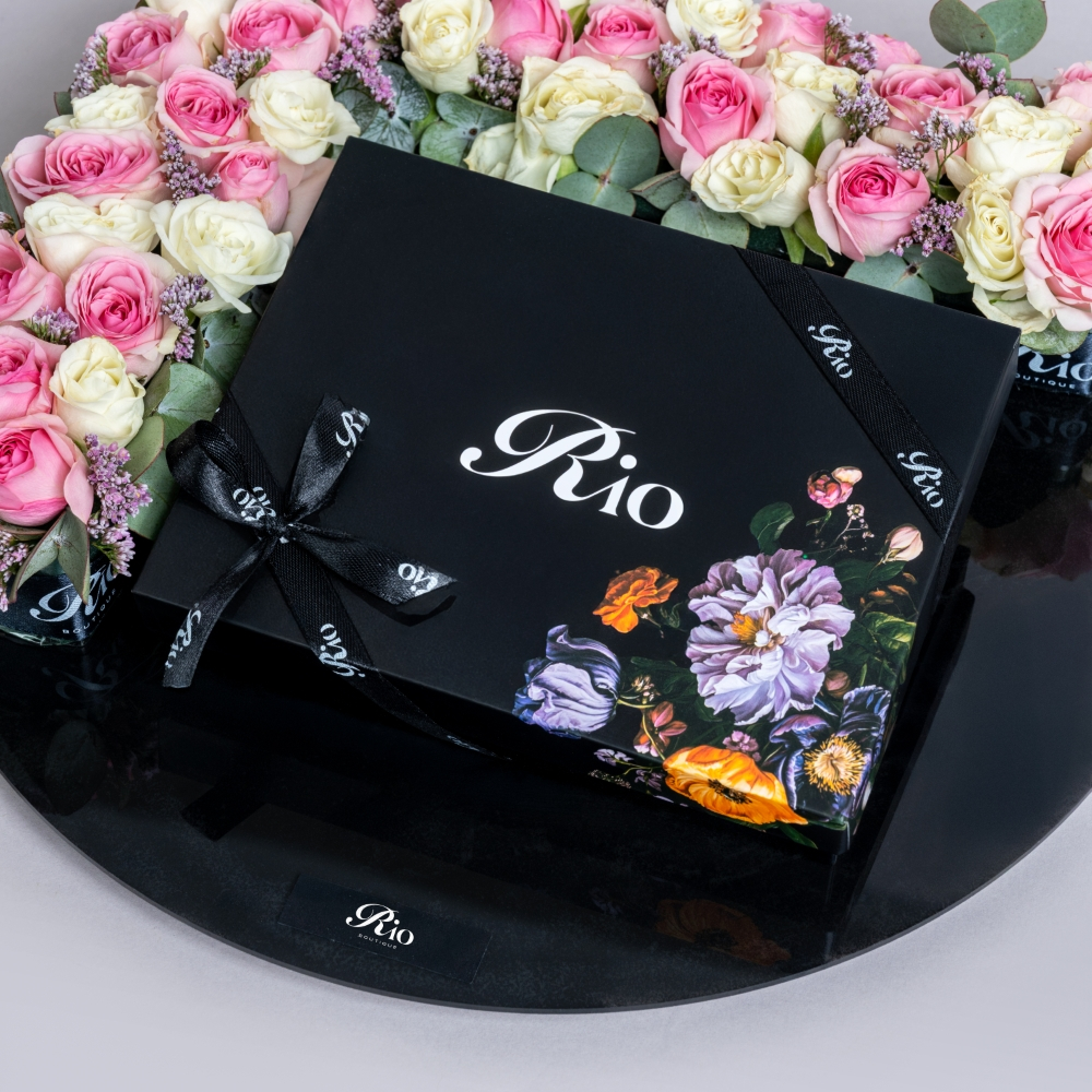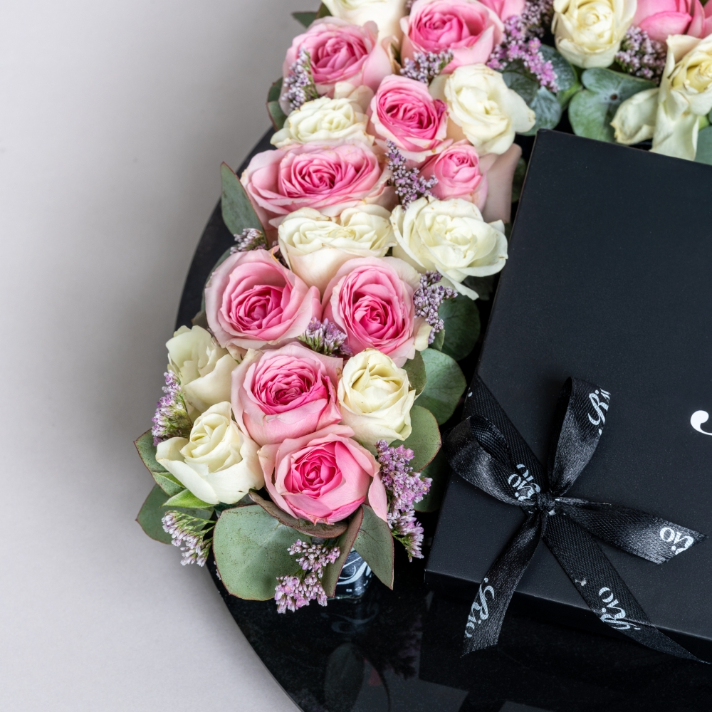A tray filled with baby roses alongside a box of luxurious French chocolate. A refined gesture that combines beauty and sweetness for any special occasion.