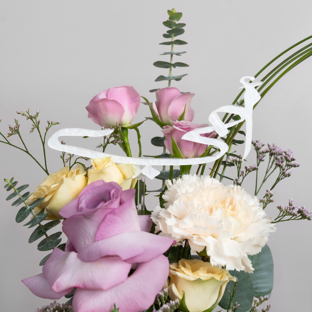 A box featuring roses, baby roses, carnations, and limonium paired with a box of delicious French chocolate and a Mother's Day topper. A luxurious gift designed to honor her with elegance.