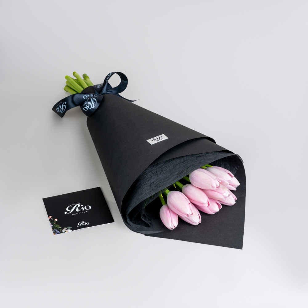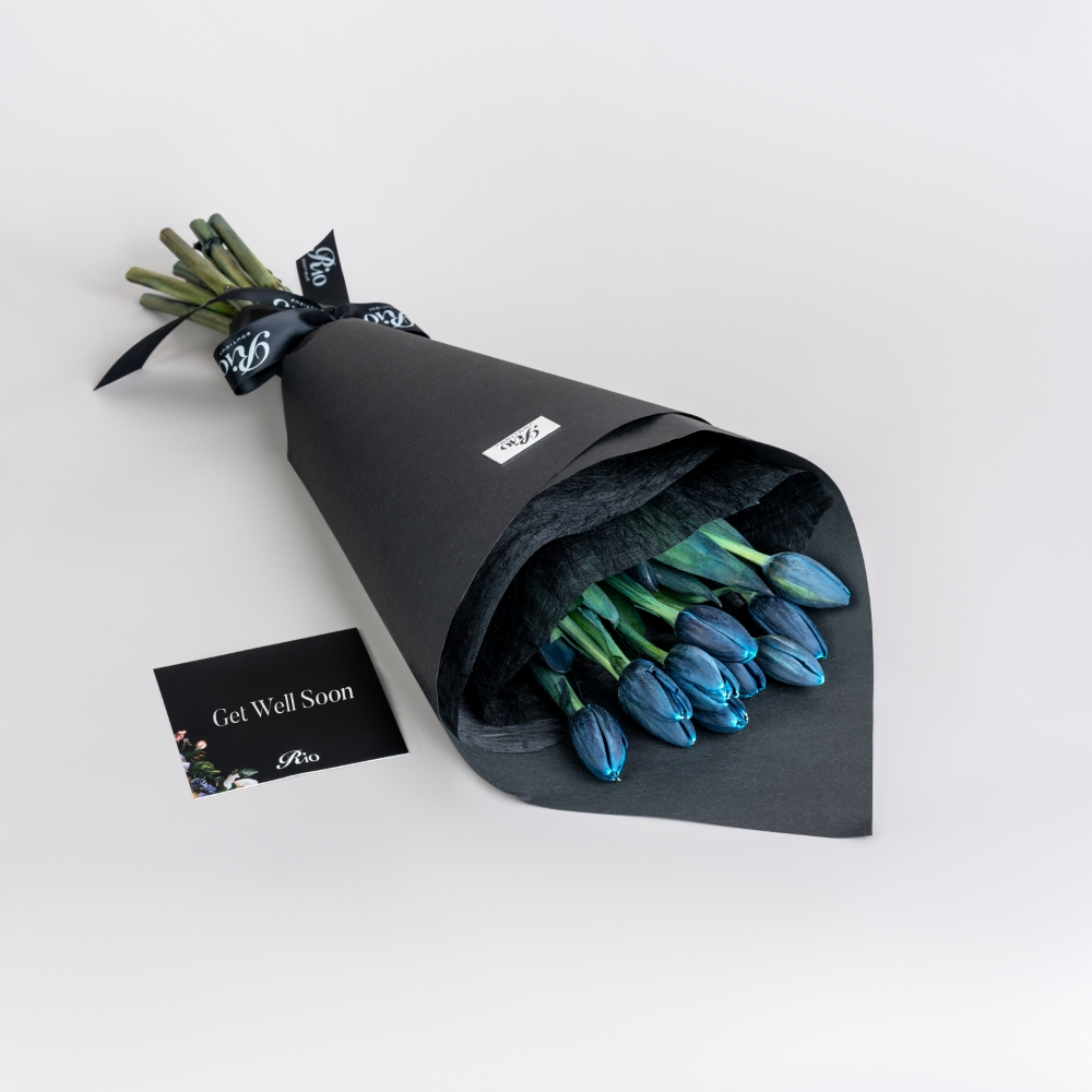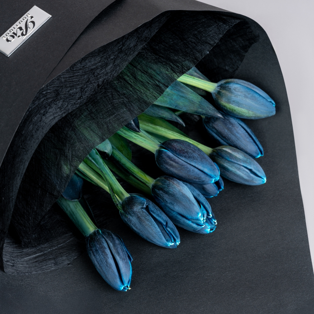 A hand bouquet of 11 blue tulips arranged with simplicity and grace. A unique floral gift symbolizing peace, trust, and calm emotions.
