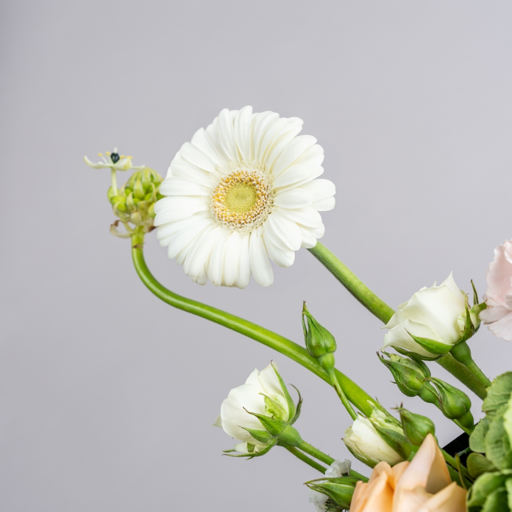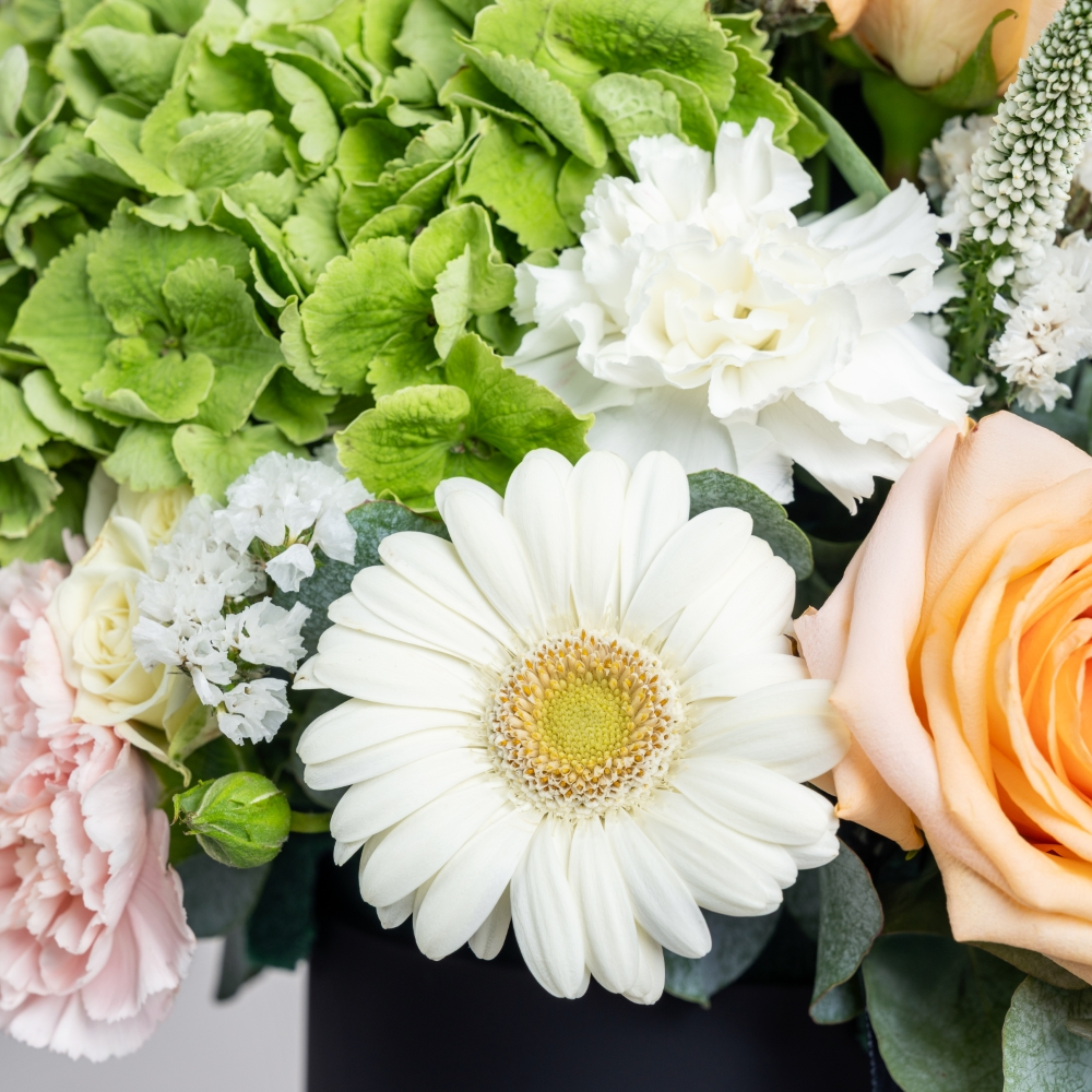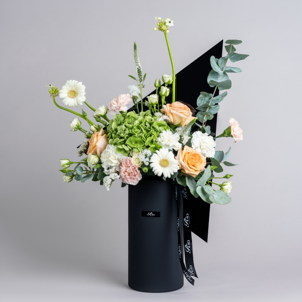 A tall vase filled with roses, baby roses, hydrangeas, and carnations. Its romantic touch makes it perfect for elegant occasions.
