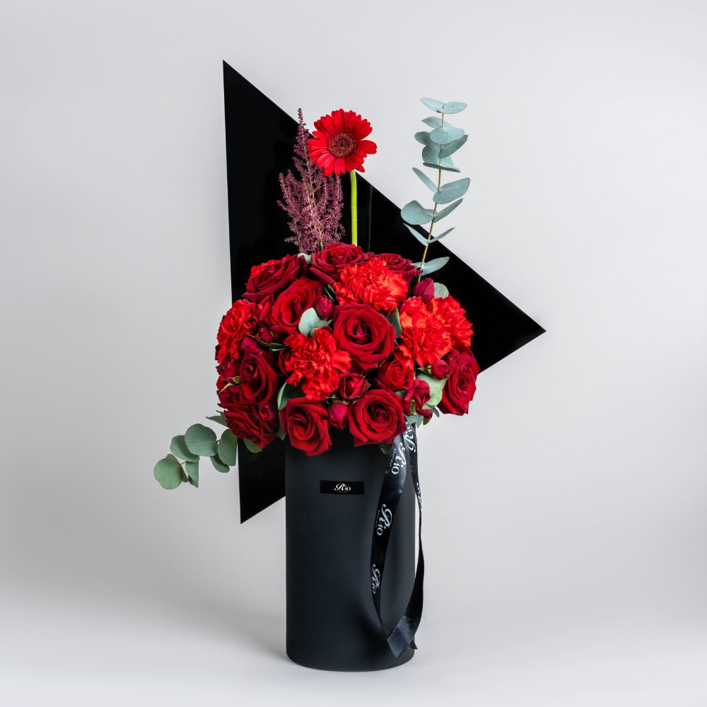A long vase arranged with gerberas, roses, carnations, and astilbe, a charming floral display fit for any occasion.