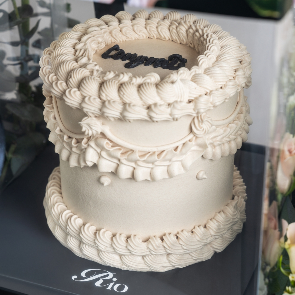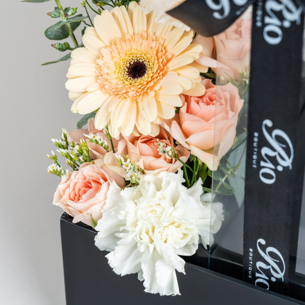 A charming box of gerberas, roses, baby roses, and carnations with a cake. A cheerful surprise for congratulations or any special moment.