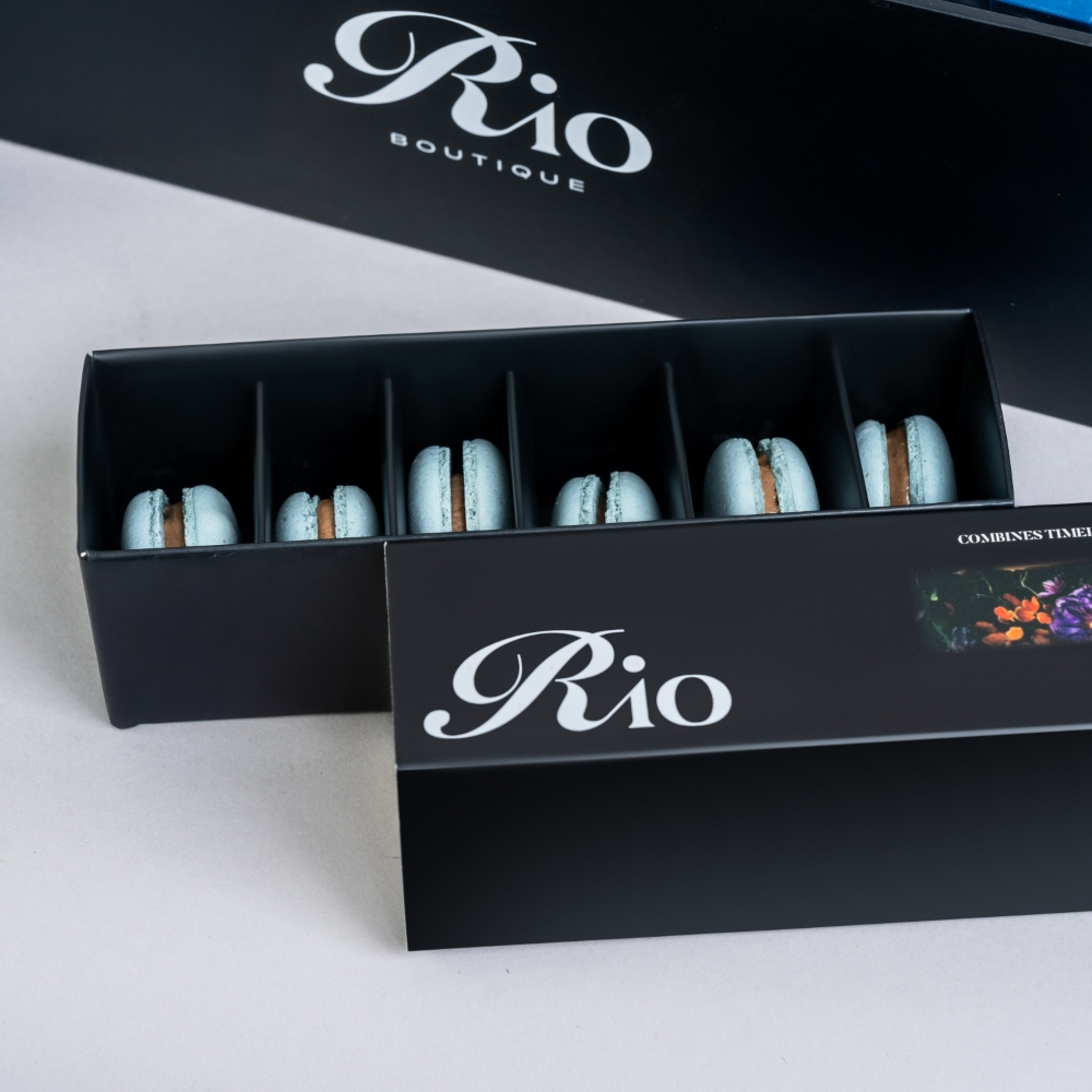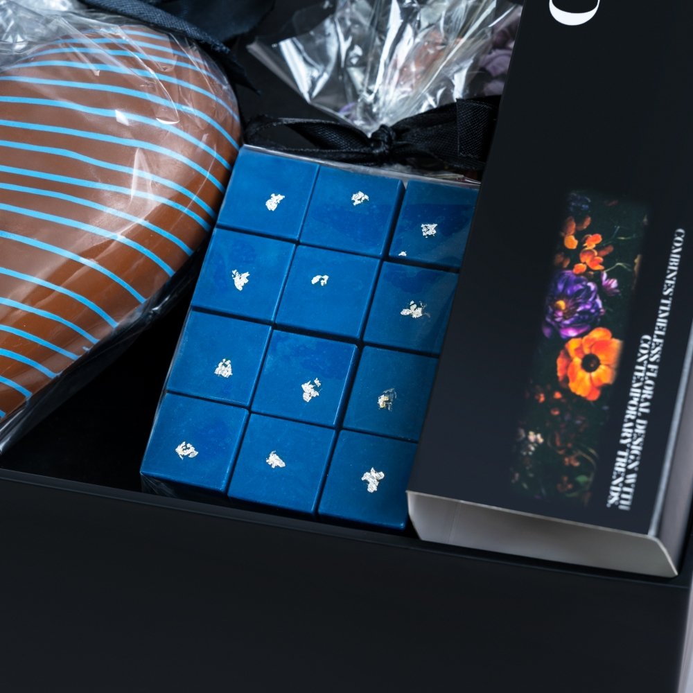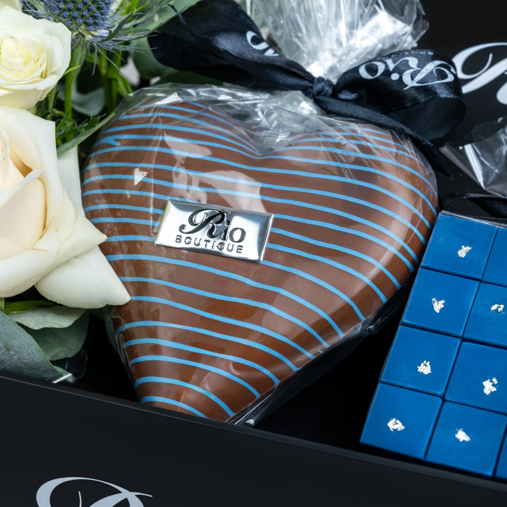 A box adorned with roses, baby roses, and carnations, complemented by an elegant selection of chocolates including a heart-shaped piece, a box, a small pack, and a box of macarons. A graceful gift that perfectly blends beauty and sweetness, ideal for celebrating any special occasion.