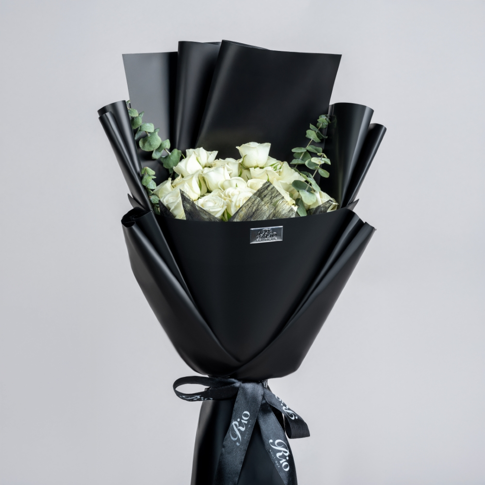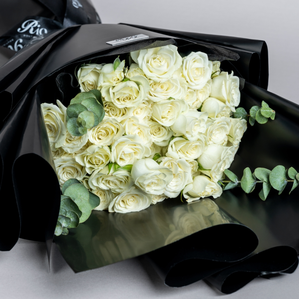 A bouquet of 10 white baby roses with a box of macaroons. Simple, pure, and sweet for any gathering.