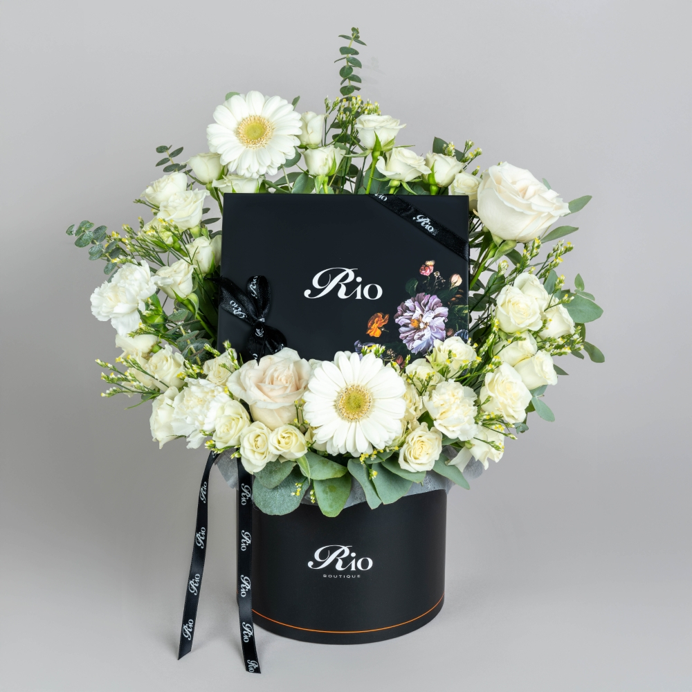 A luxurious box of gerberas, roses, carnations, and baby roses paired with a box of fine French chocolate. A sophisticated creation that radiates charm and sweetness in every detail