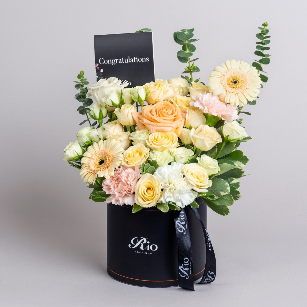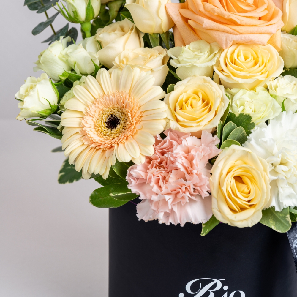 A box of gerberas, roses, baby roses, and carnations in radiant harmony. Perfect for birthdays or adding color to any event.