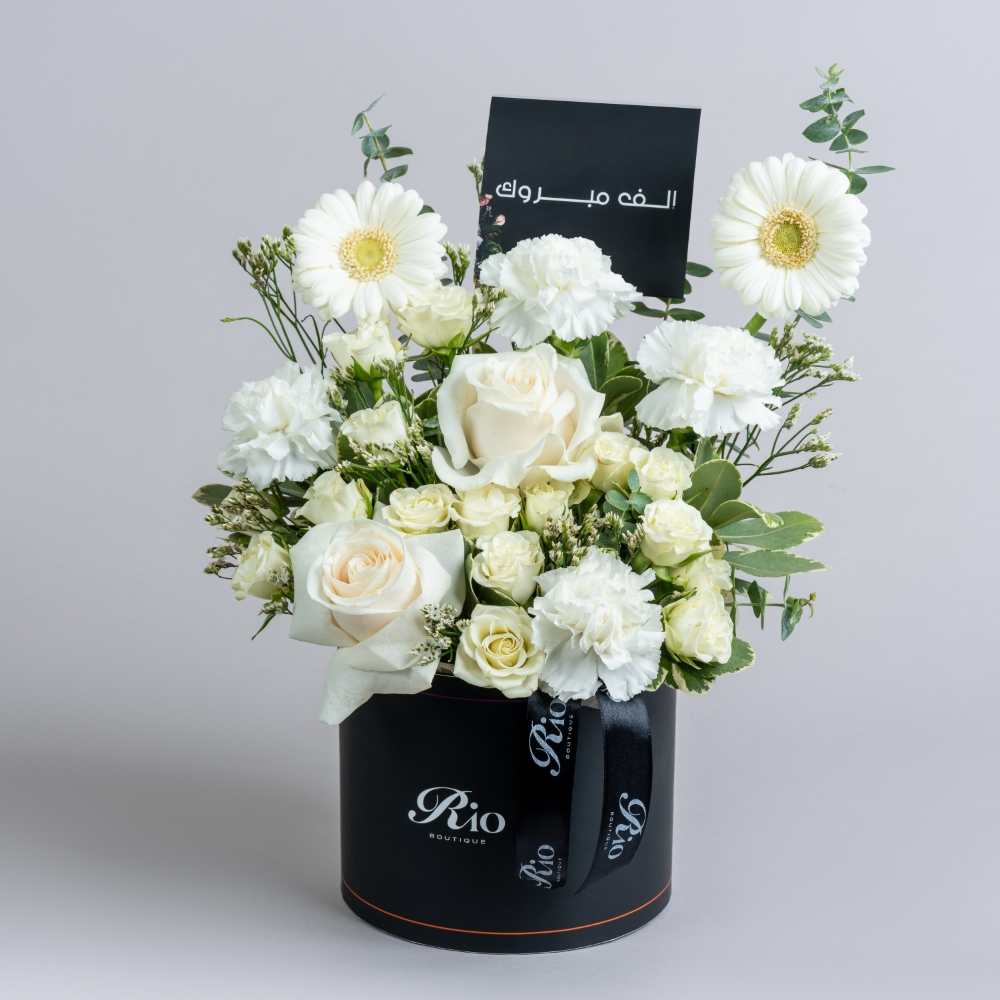 A radiant box of gerberas, carnations, roses, and baby roses. A cheerful floral piece ready for any occasion.