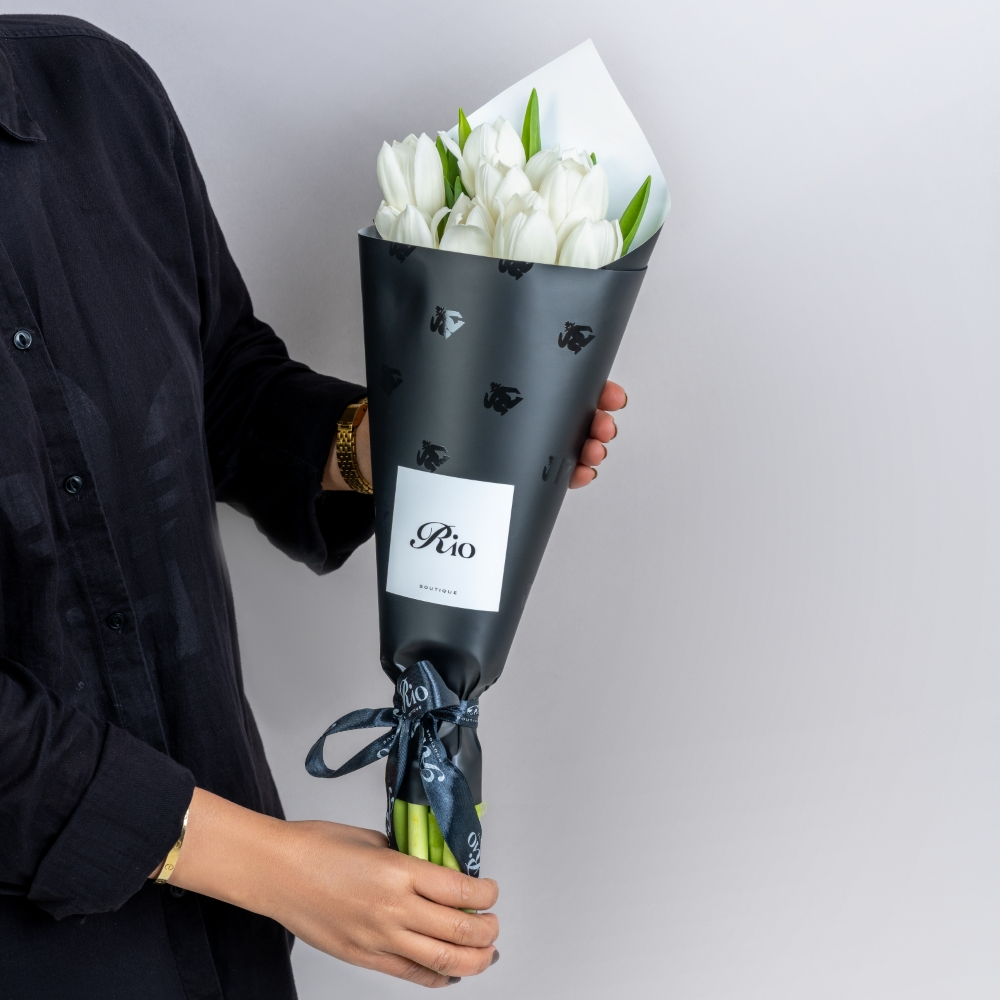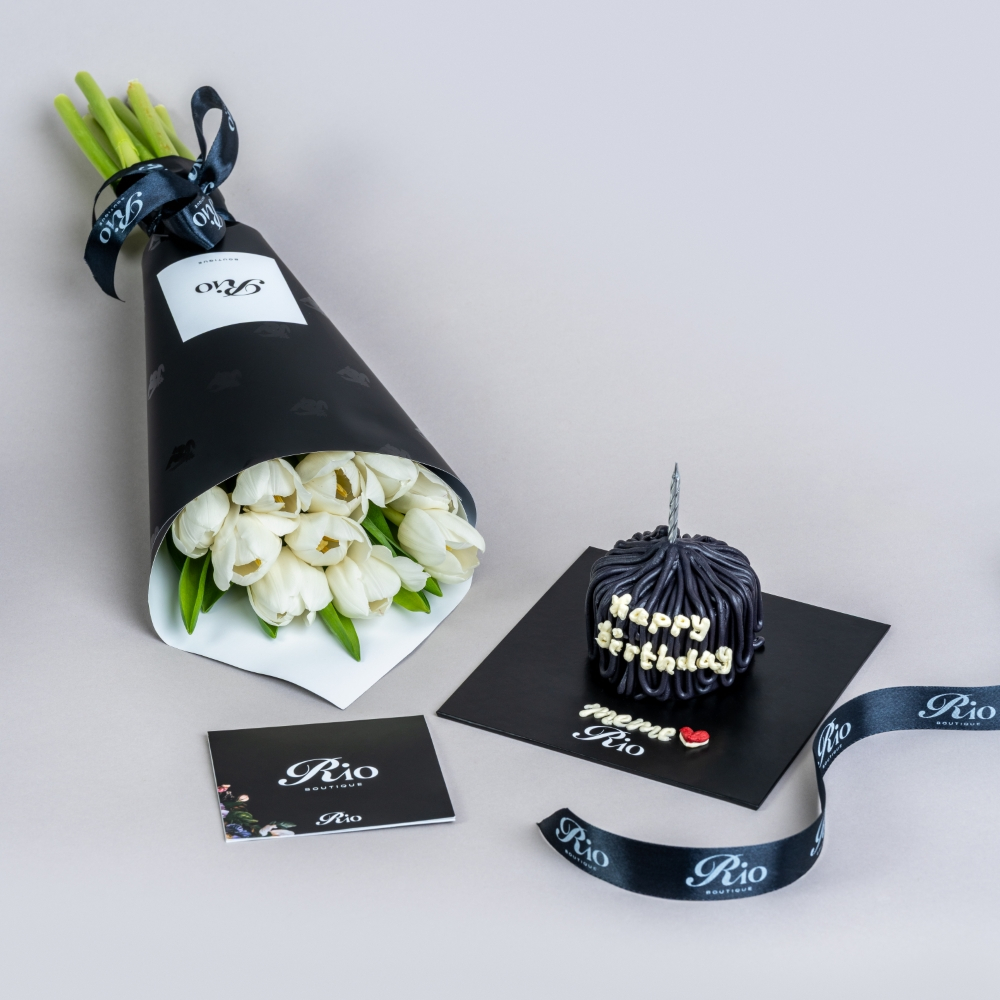 A charming hand bouquet of 10 tulips with a cake. A heartfelt way to say happy birthday or celebrate life.