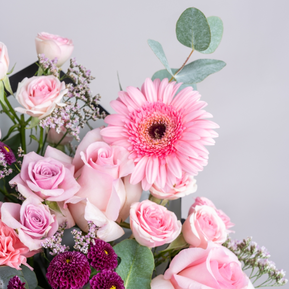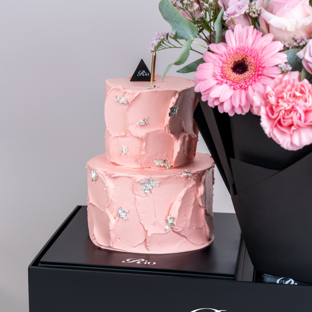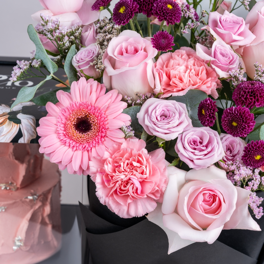 A box with a hand bouquet featuring roses, baby roses, chrysanthemums, and carnations, along with a delicious cake. A graceful gift made to celebrate heartfelt occasions with warmth and elegance.