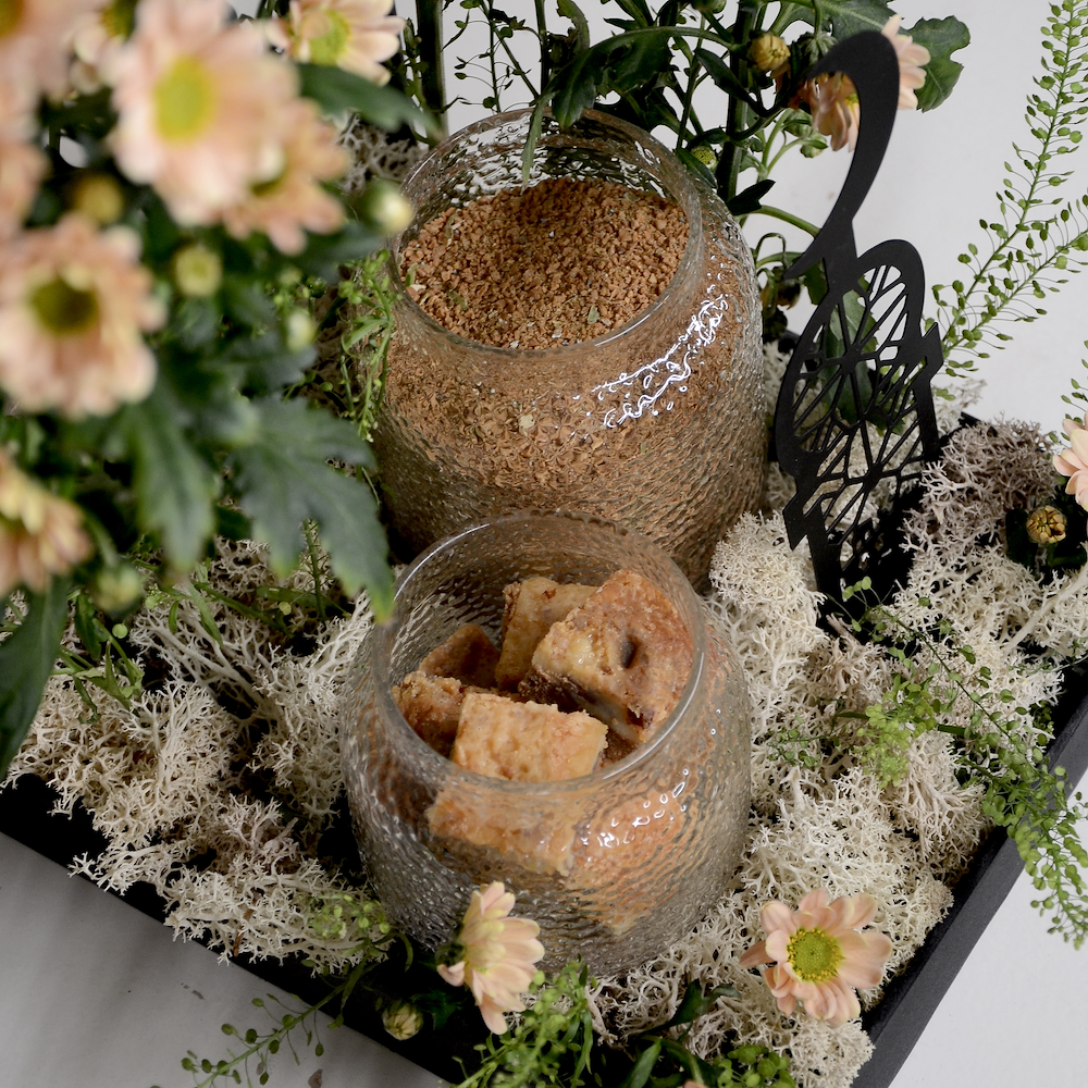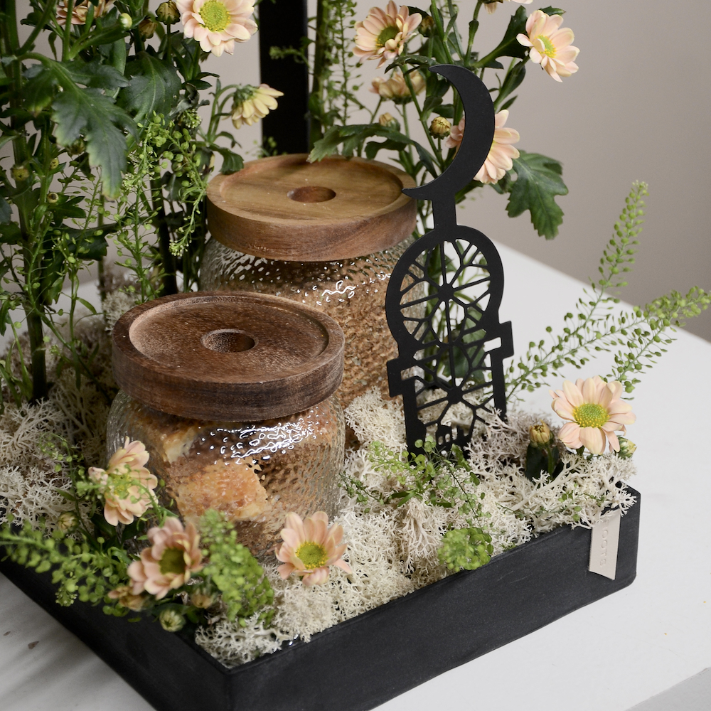 An elegant black metal stand, styled with fresh flowers in soft blush tones, creating a calm and modern look, includes black metal stand, fresh natural flowers, two glass jars with wooden lids, contains 500mg arabic coffee, pecan sweet bite, simple decorative accents, perfect for gifting, or adding a subtle touch of elegance to any space.