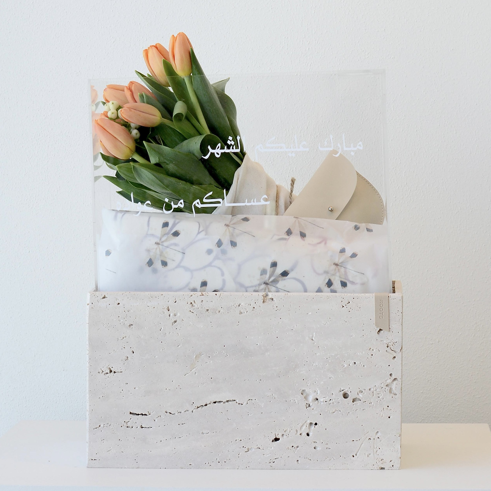 A travertine box that contains tulip flowers with a free size kaftan and 1 tola super soyofi bokhour.