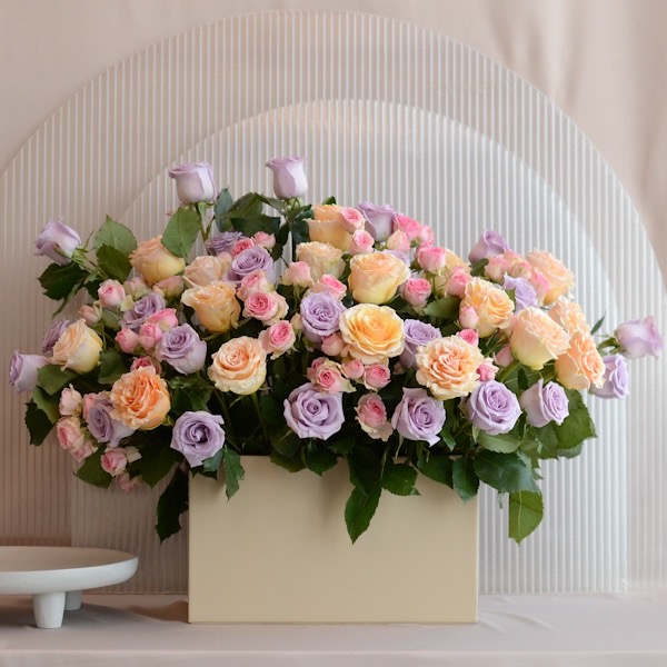 Leather box that contain mixed roses flowers.