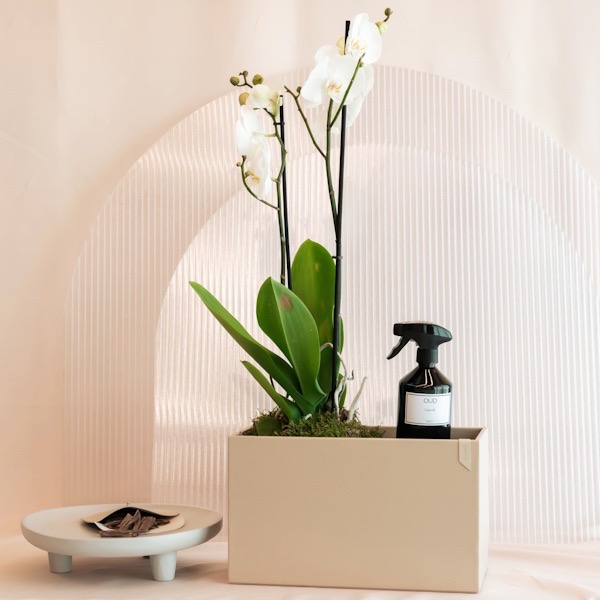 Leather box that contain orchid flowers with home spray and 1 tola bukhor super soyofi.
