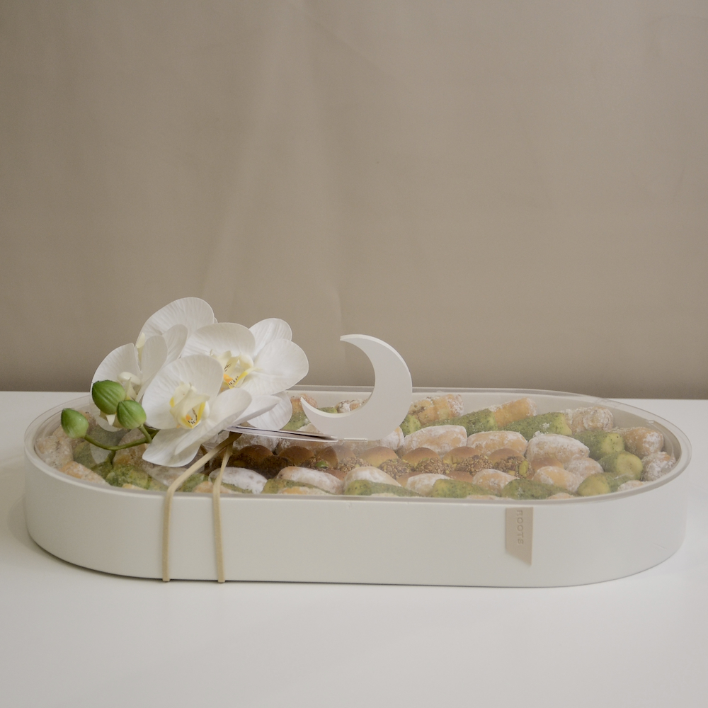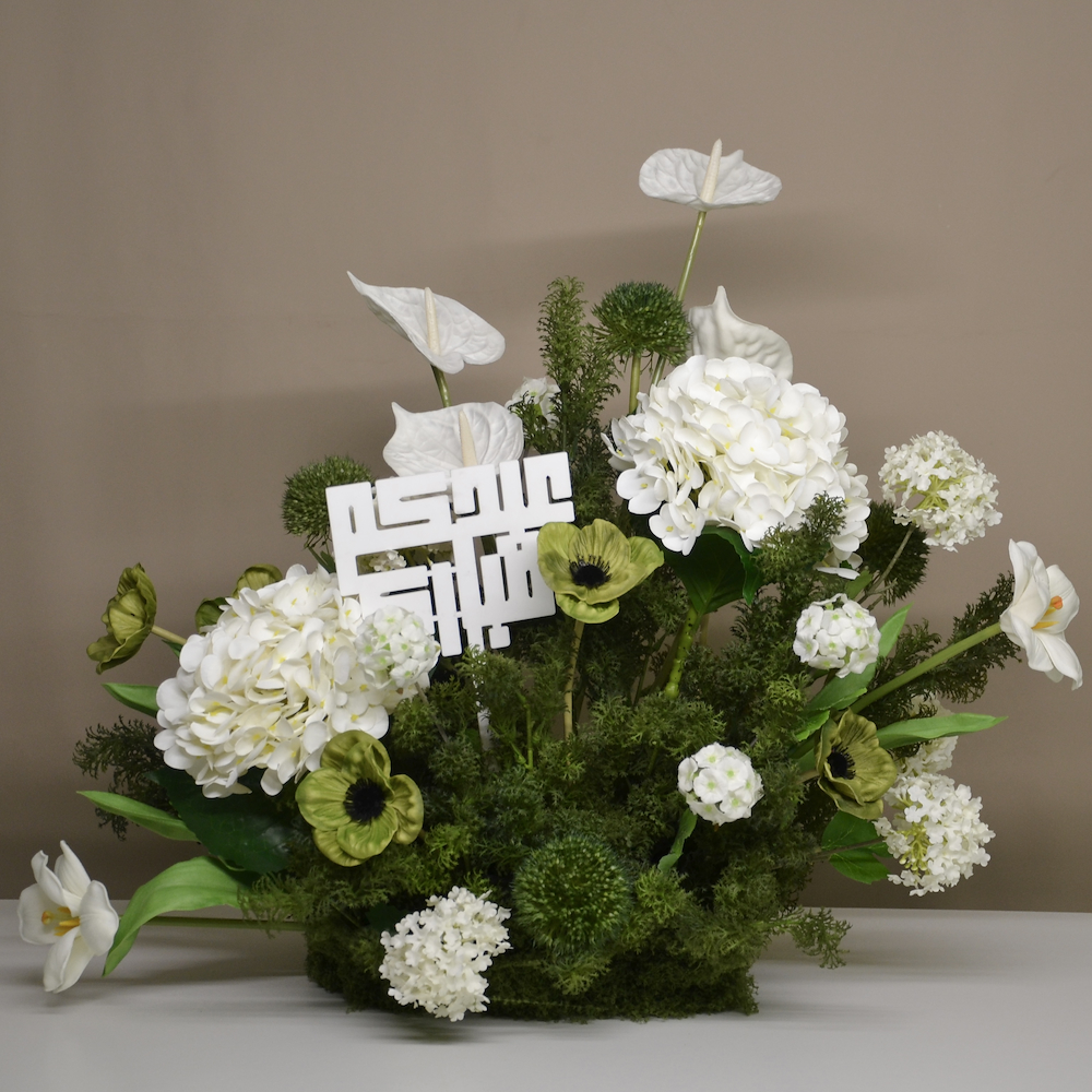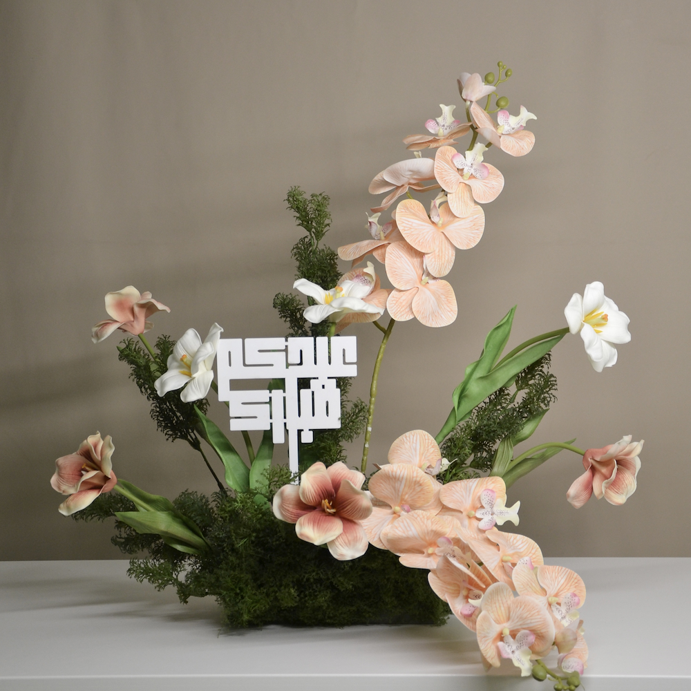 A travertine tray contains carnation flowers.