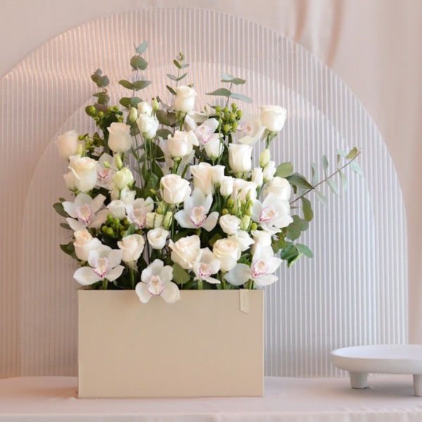 Leather box that contain mixed roses flowers.