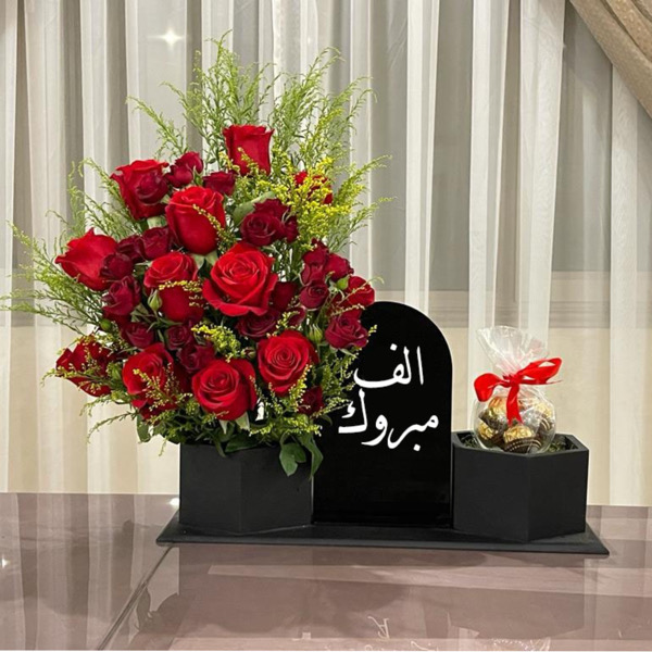 A stand contains roses and baby roses flowers with chocolates.