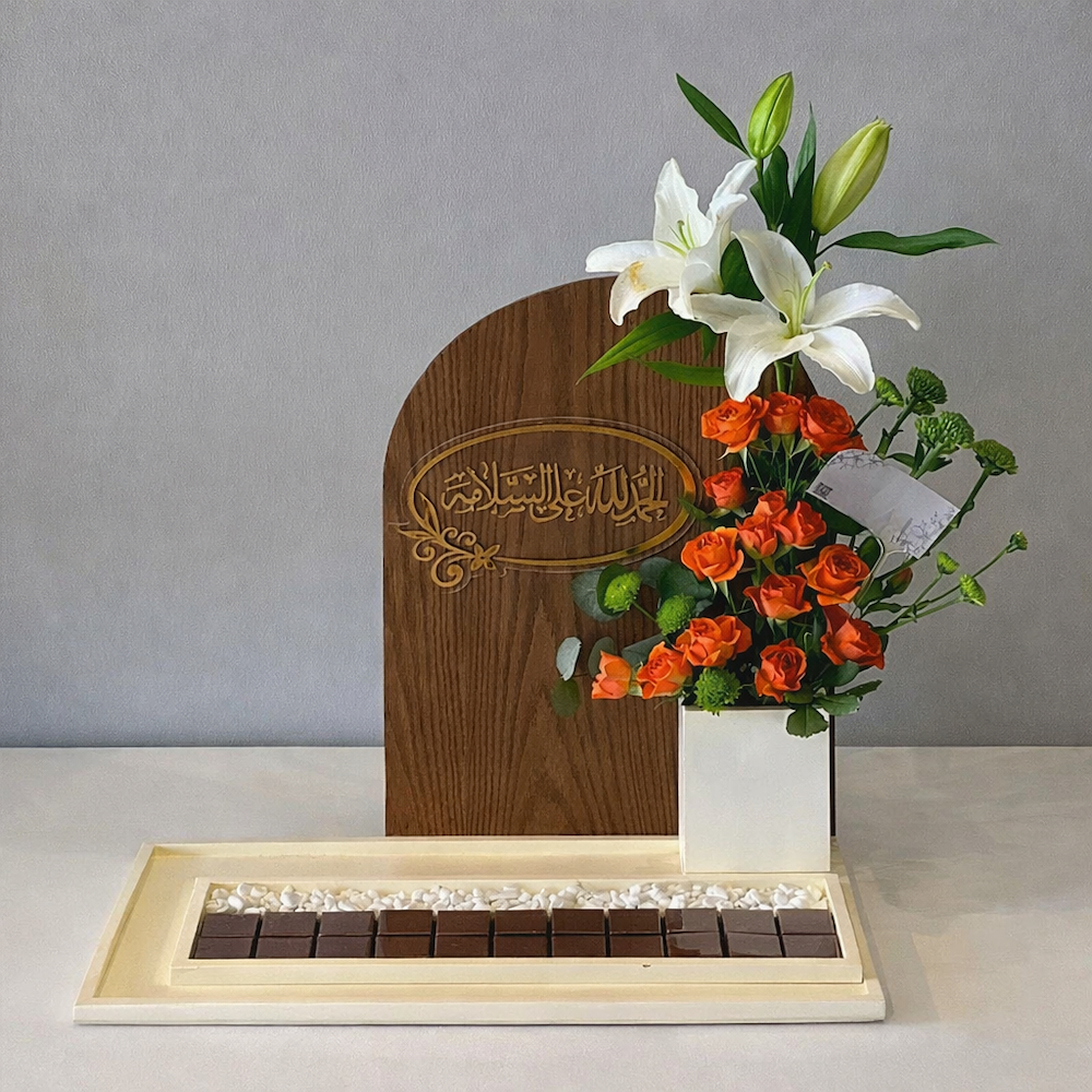 This bouquet contains baby roses and casablanca flowers with chocolates.