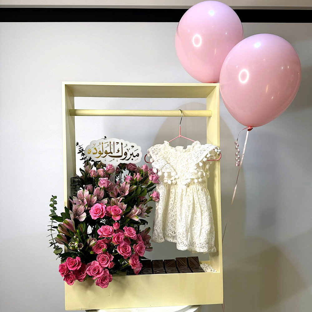 An elegant bouquet, featuring baby roses flowers and balloons with Belgian chocolates and a baby girl dress.
