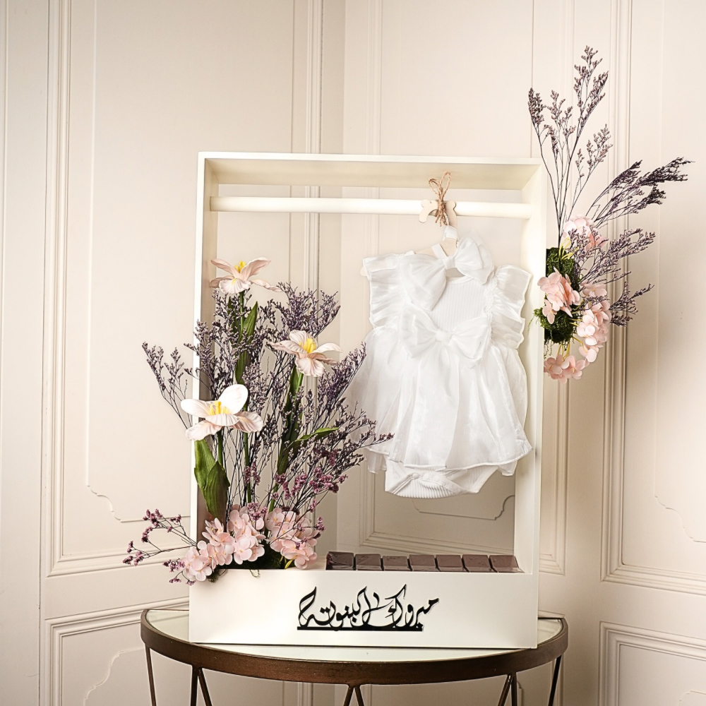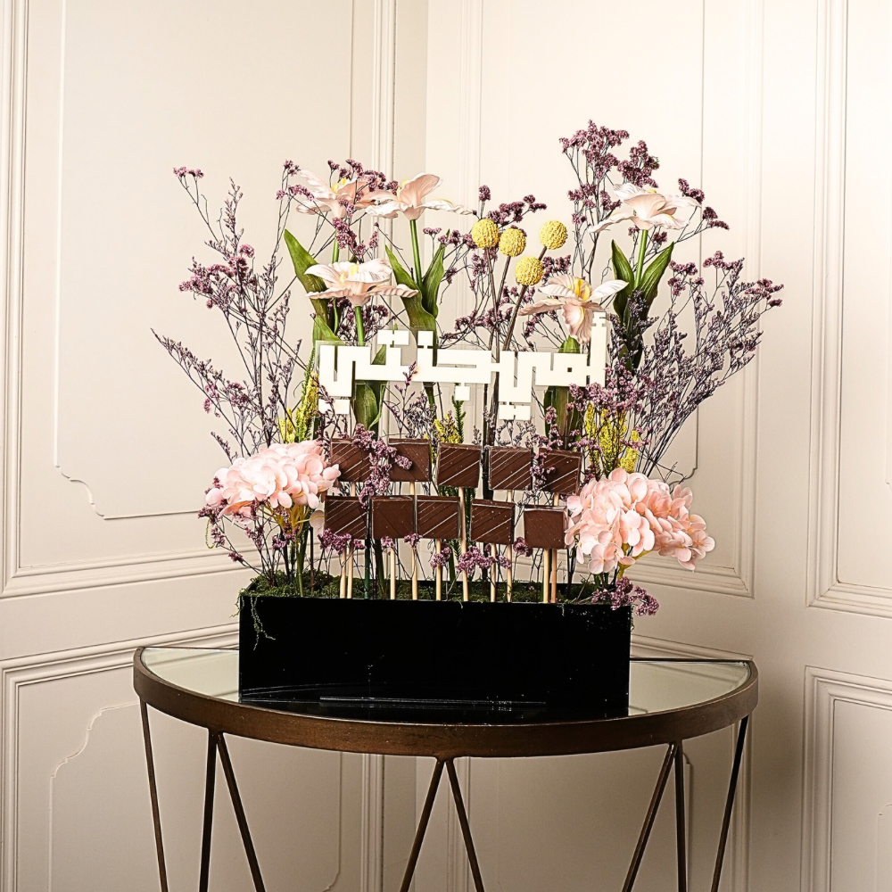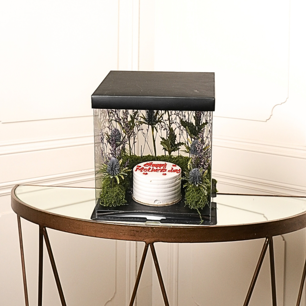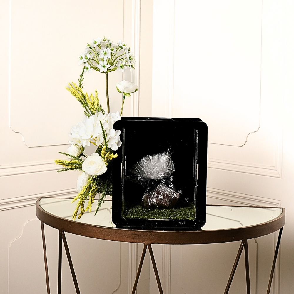 A luxurious glass box featuring chocolate pieces, completing the gifting experience with a delightful taste.