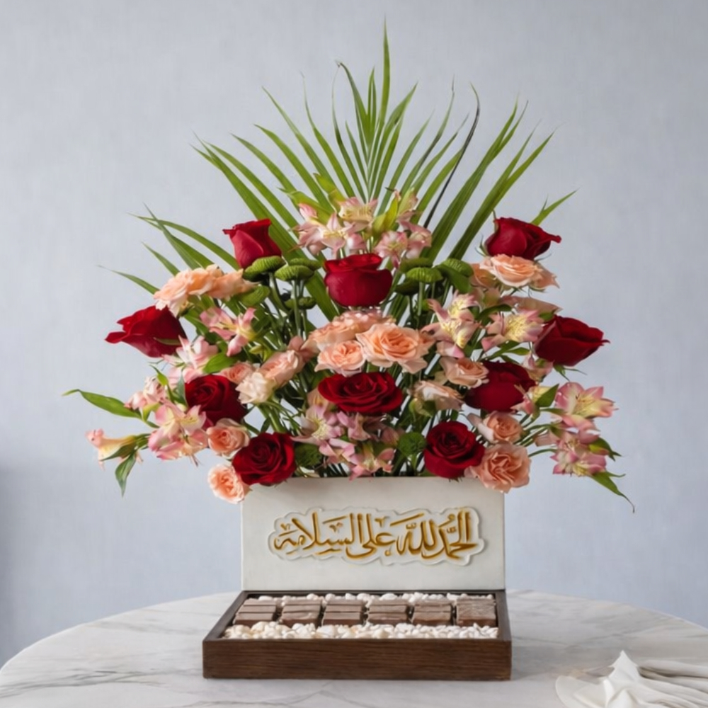 This bouquet contains roses, baby roses and alstroemeria flowers with chocolates.