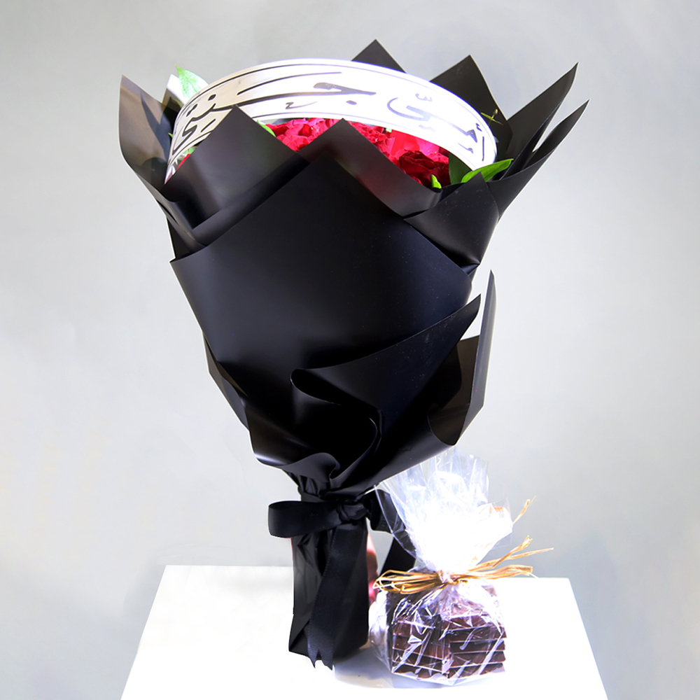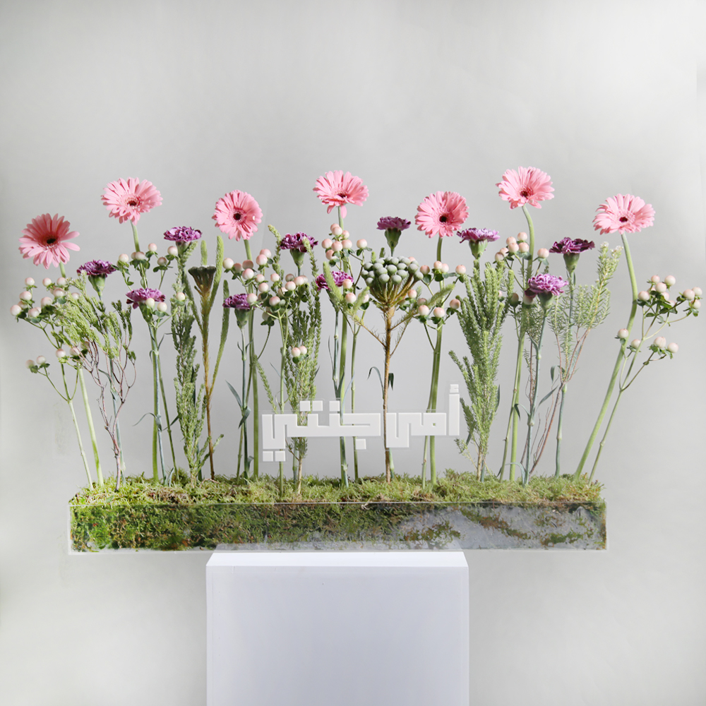 A bouquet containing gerberas and carnations, arranged beautifully in an acrylic tray.