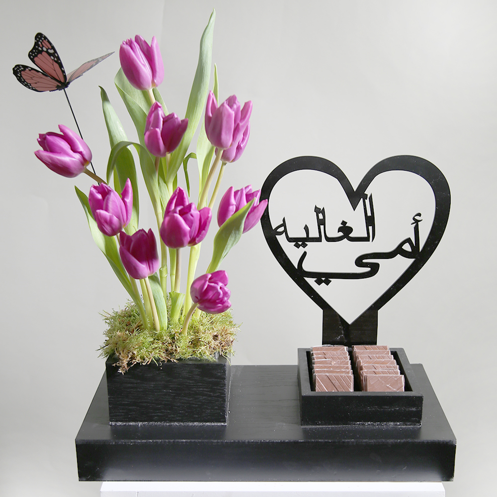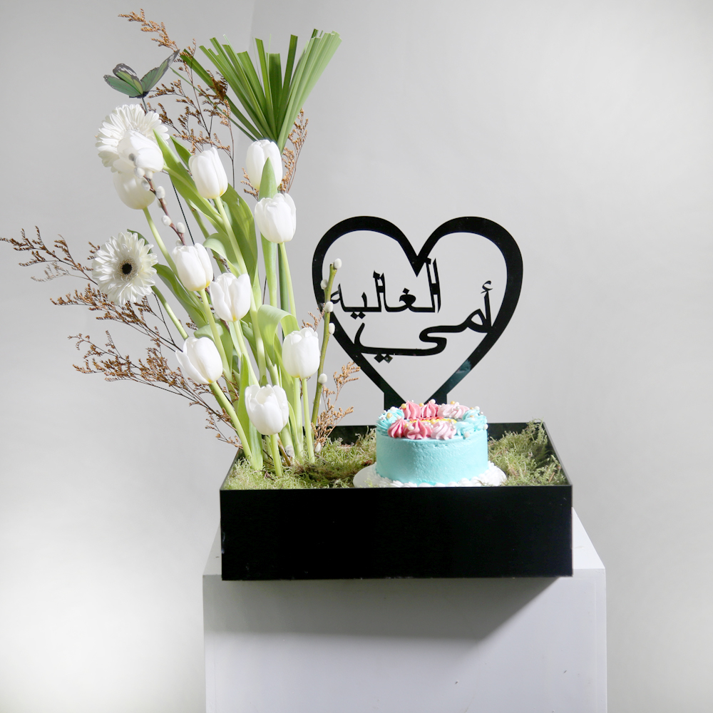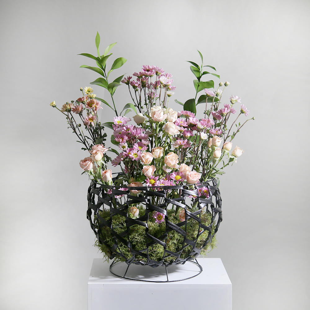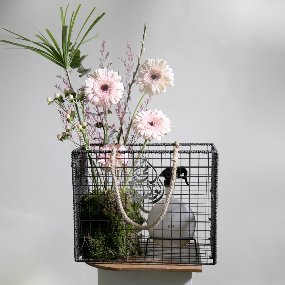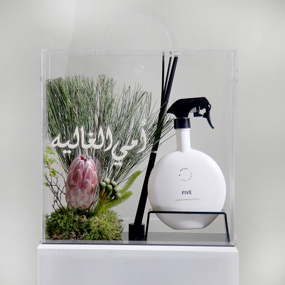 A transparent acrylic bag containing a protea flower with dried flowers and a spray.
