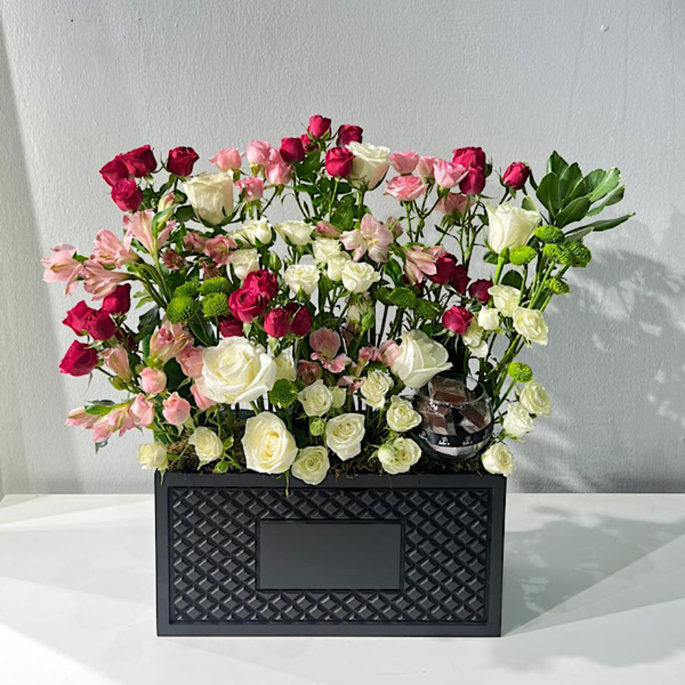 A bouquet containing roses, baby roses, and alstroemerias, arranged beautifully in a box. Comes with chocolates.