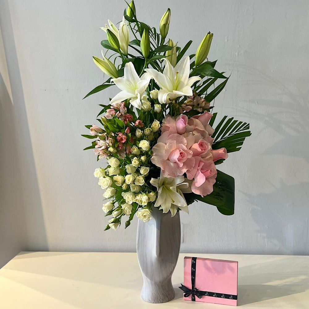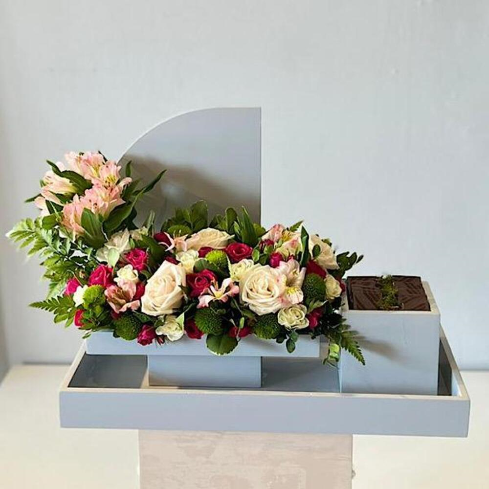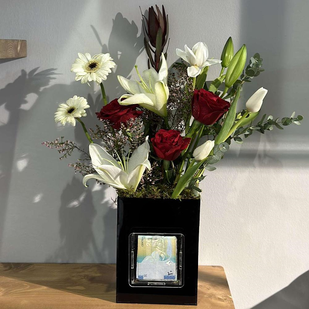 A bouquet featuring roses, baby roses and alstroemeria flowers with chocolates and an empty acrylic money pocket. Note: Money is not included.