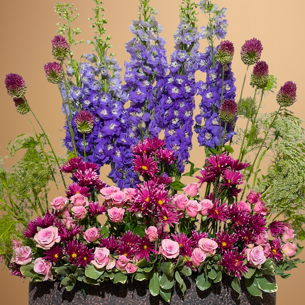 A vase filled with roses, delphiniums, chrysanthemums and alliums.