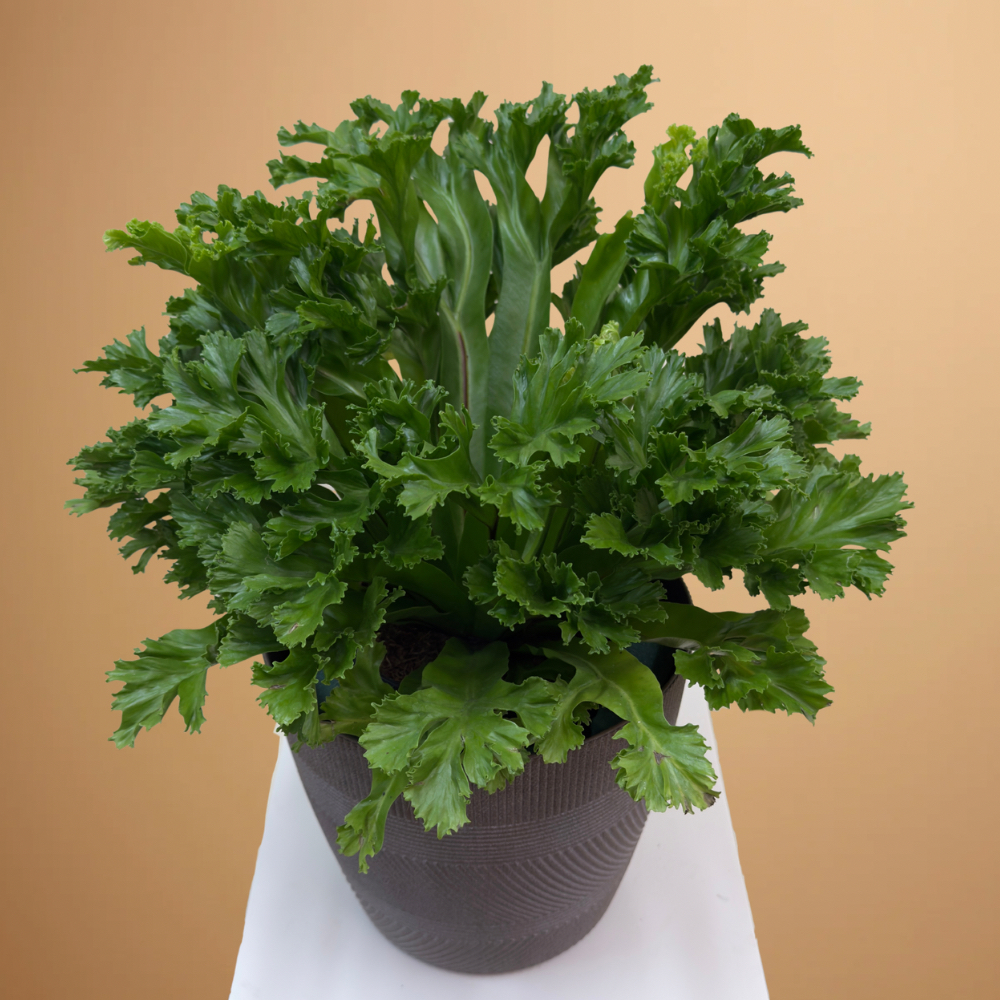 An asplenium leslie plant, arranged beautifully in a light brown fiber pot