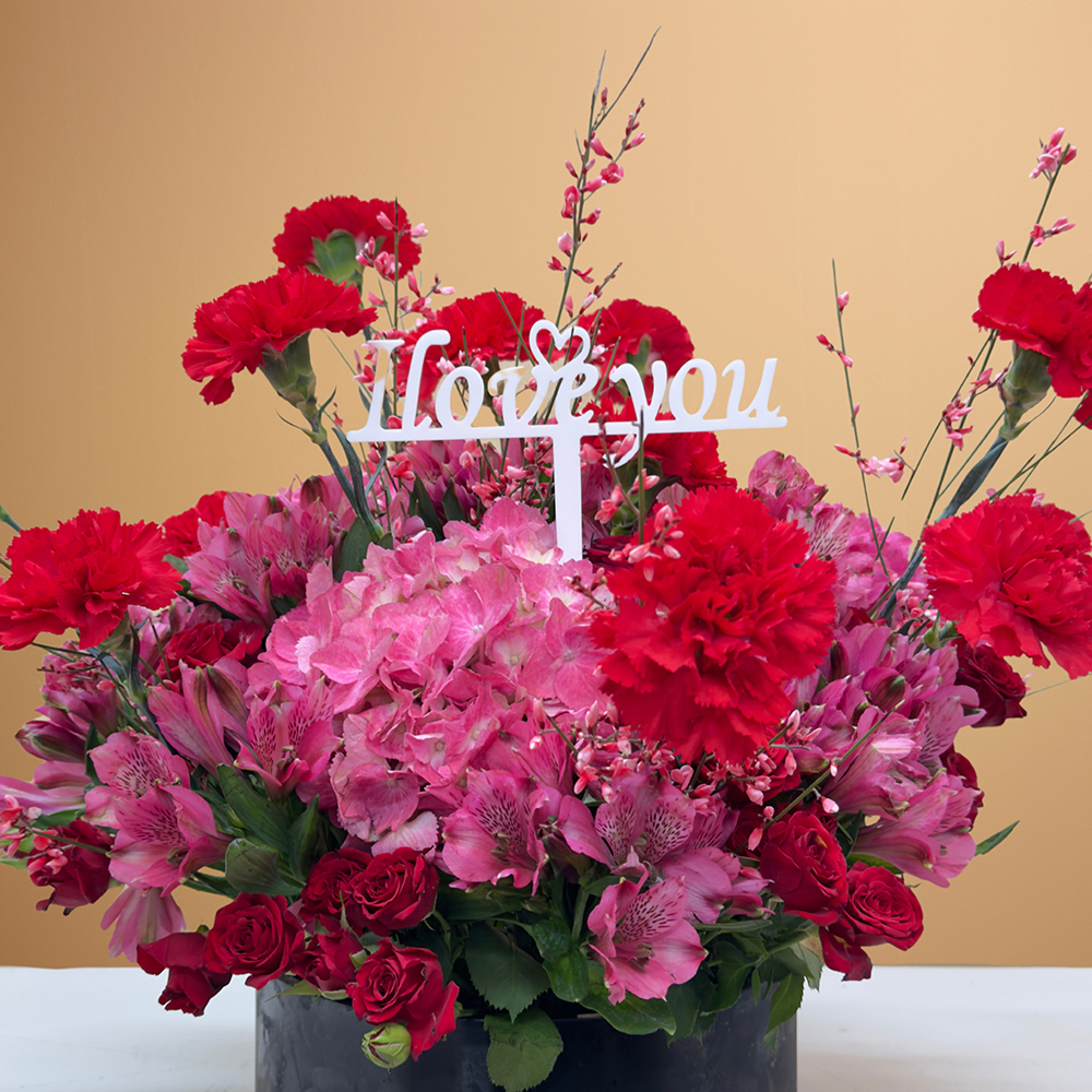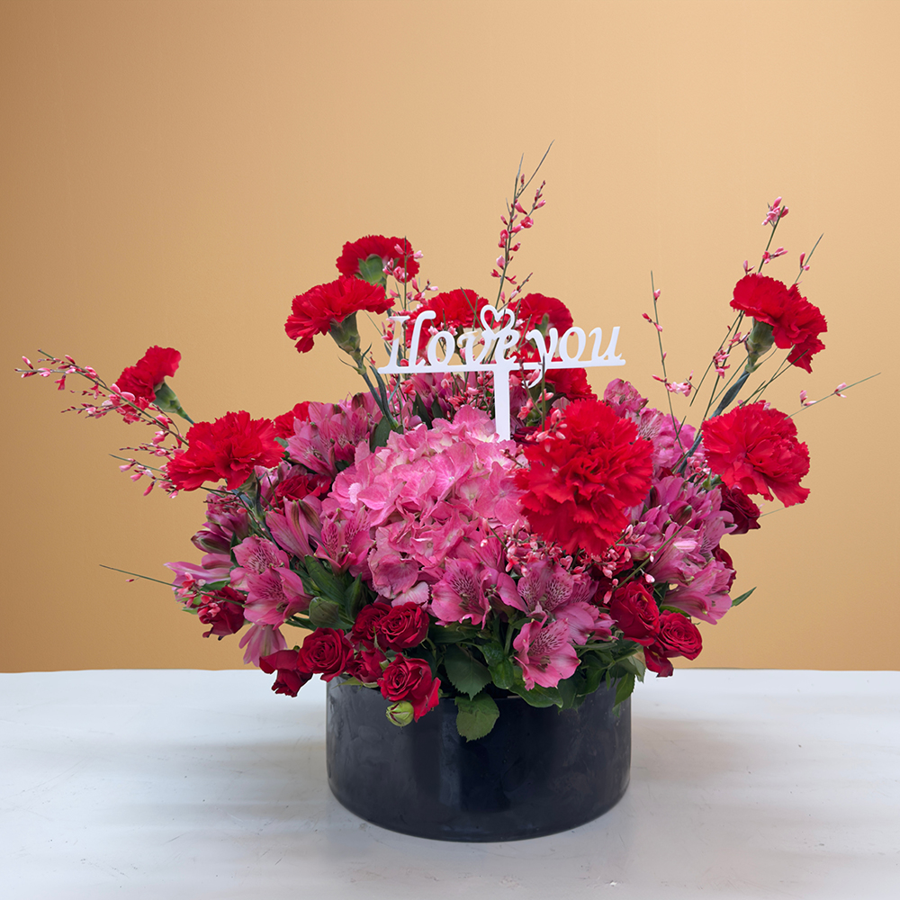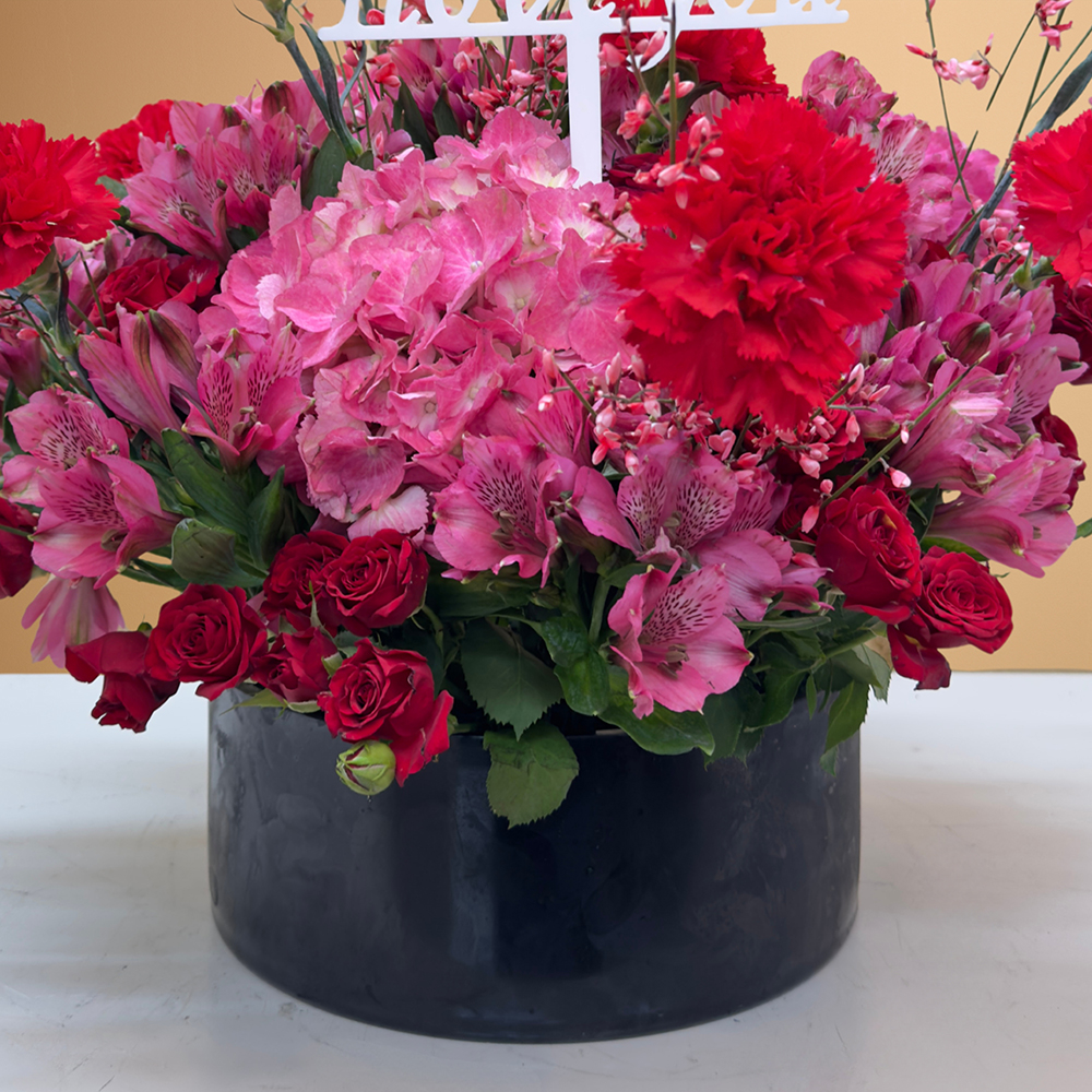 A black vase decorated with a rich mix of baby roses, hydrangeas, carnations, alstroemeria, and ginestra, beautifully arranged for an elegant display.